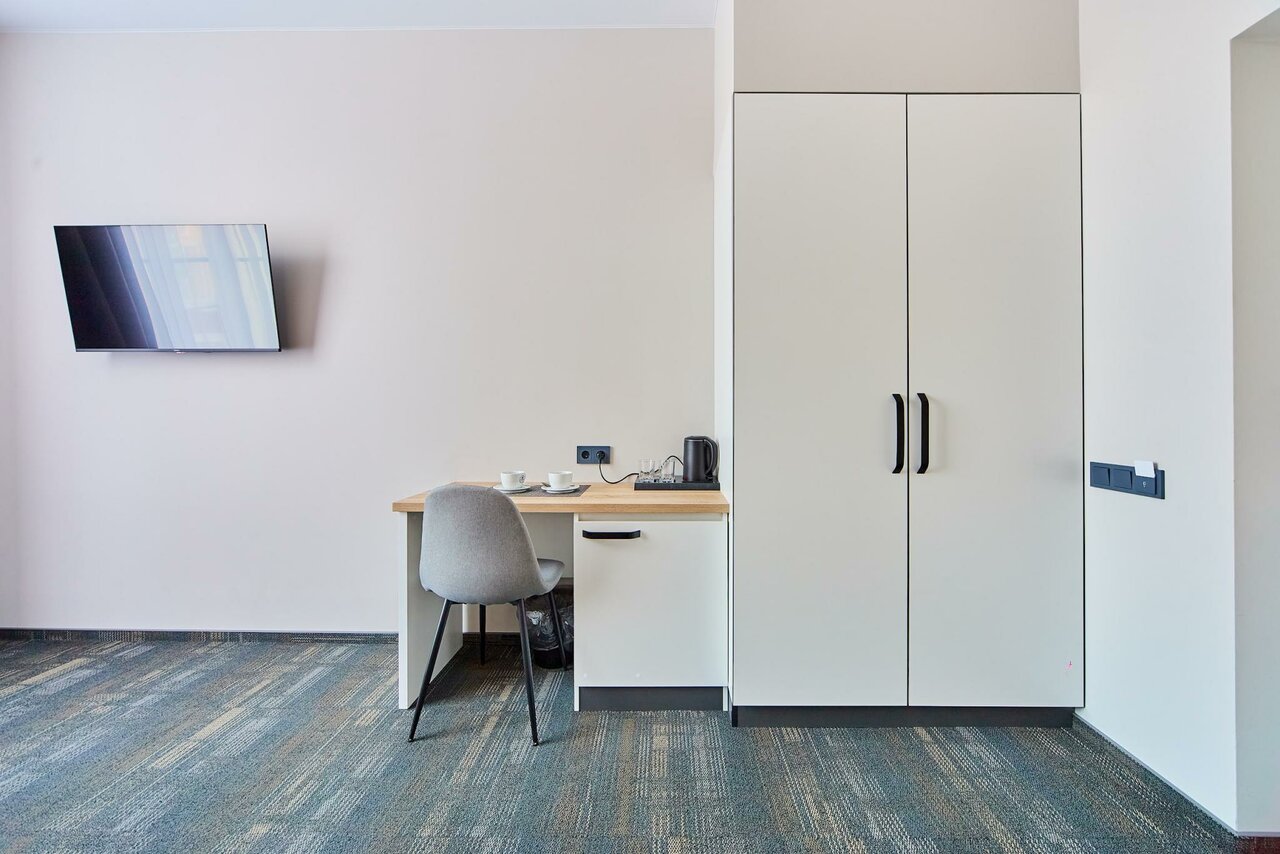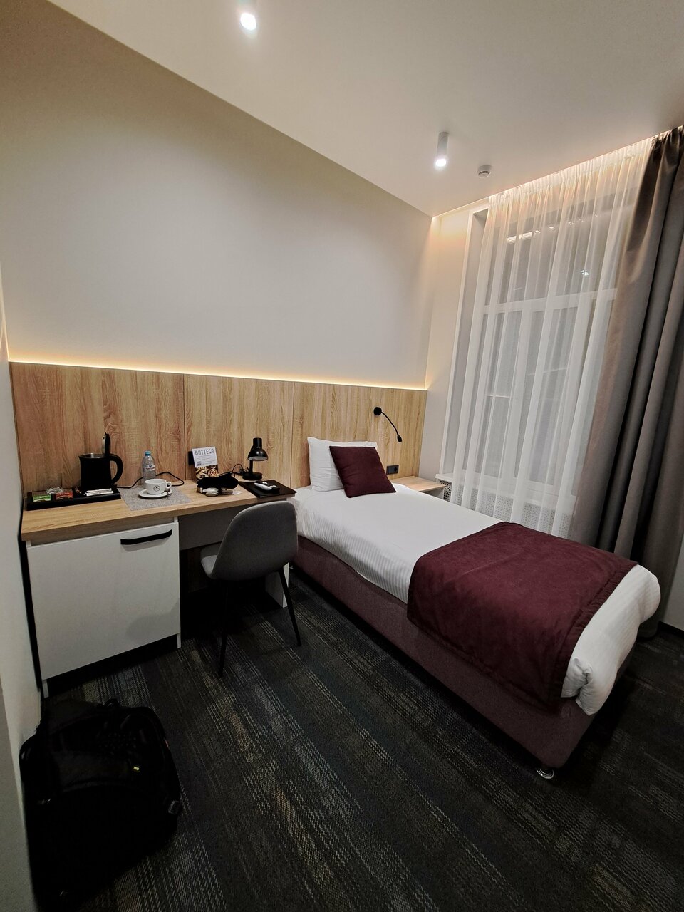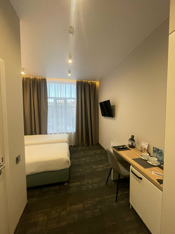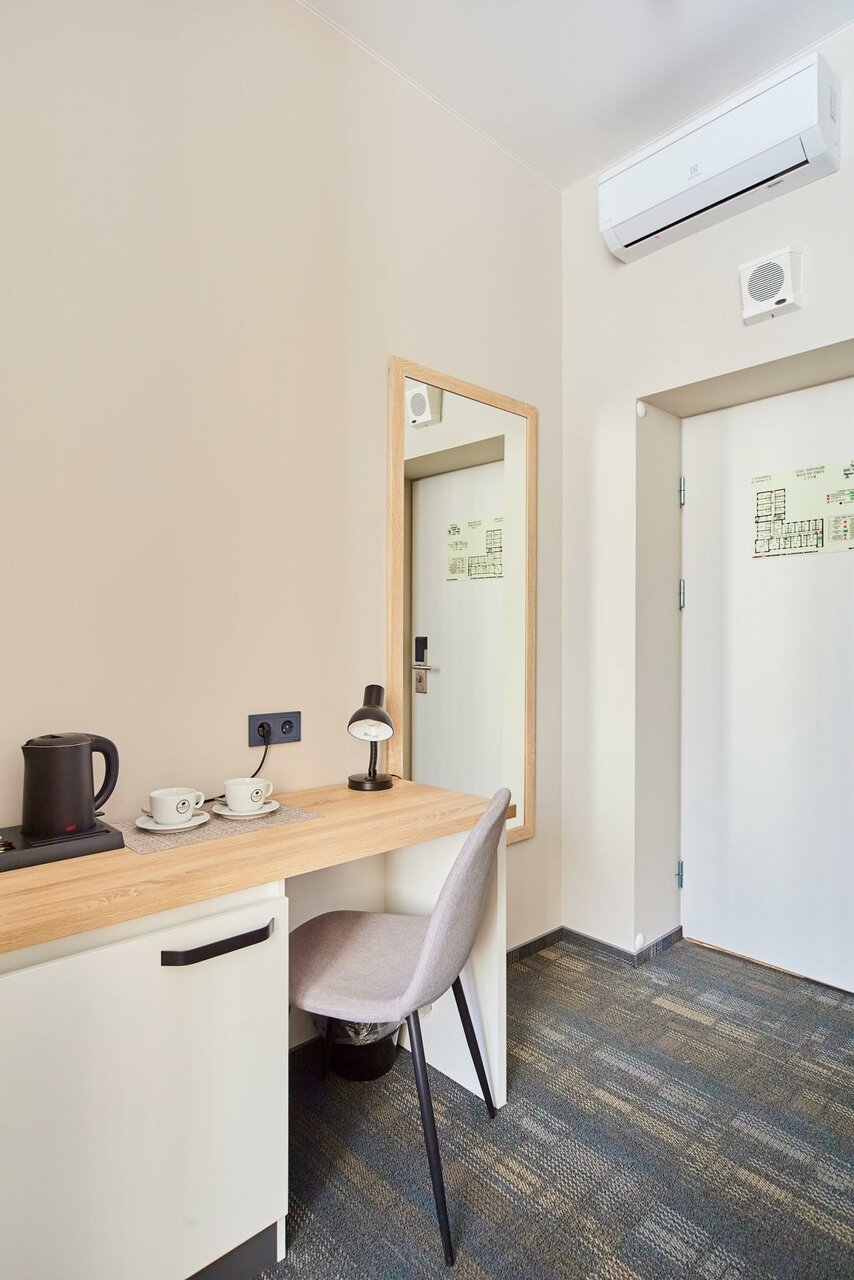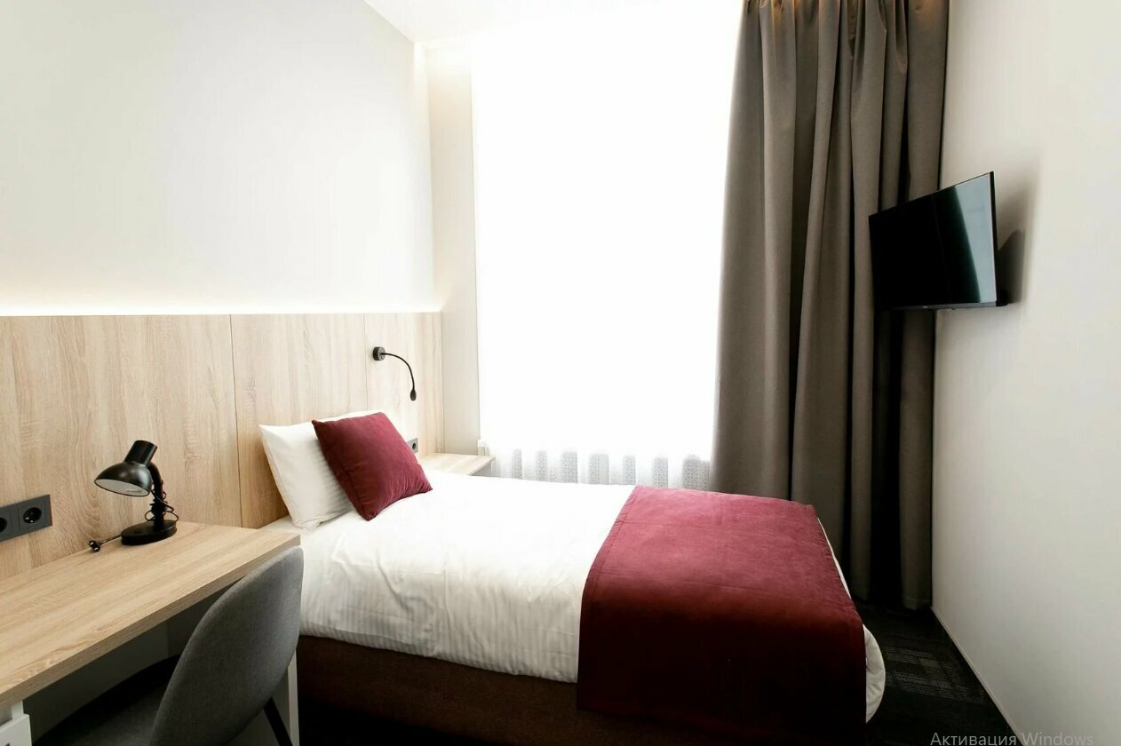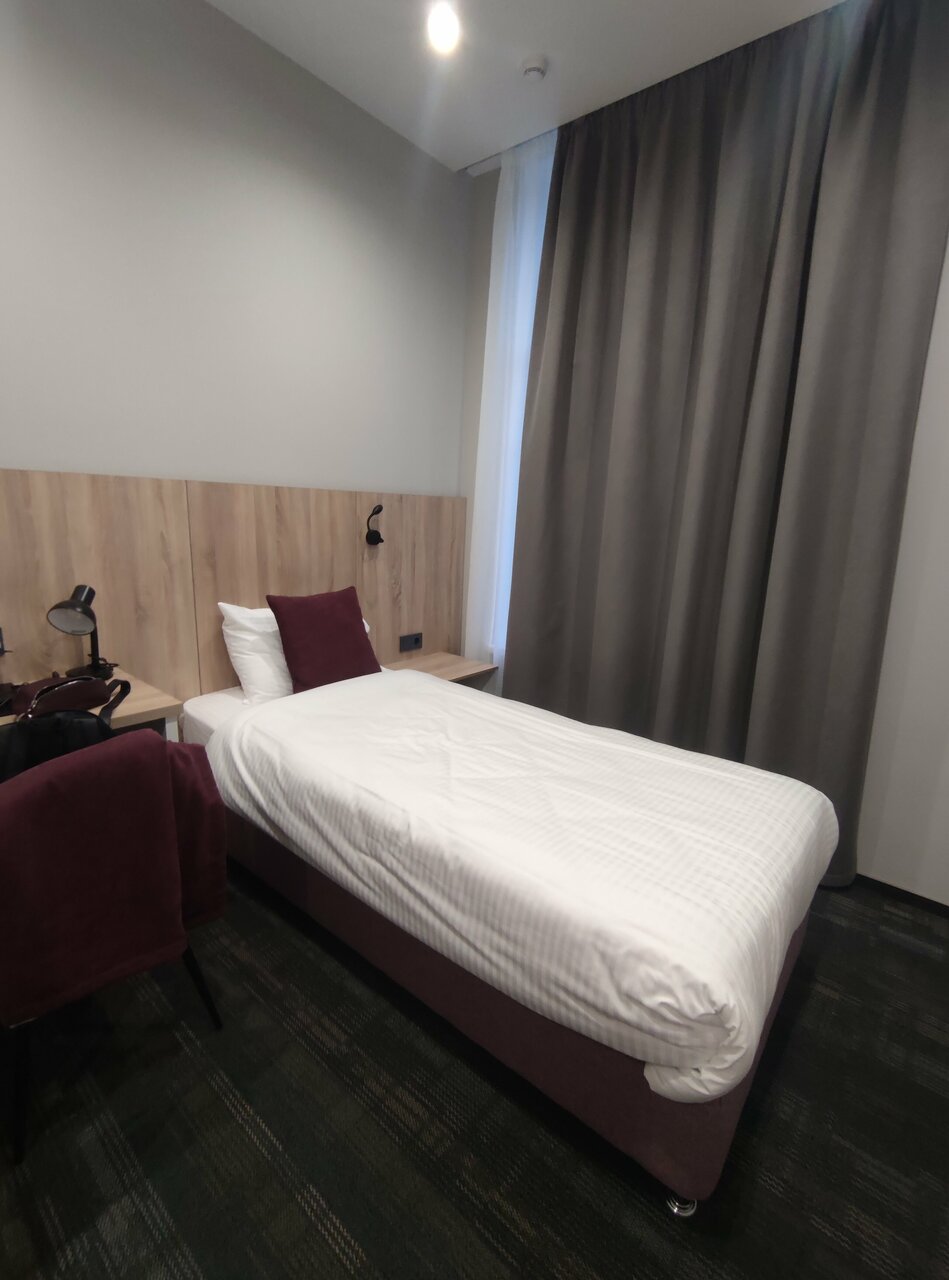 Светлый и современный стандартный номер площадью 11 кв.мНомер оснащен одной односпальной кроватью, кондиционером, телевизором с плоским экраном, холодильником и собственной ванной комнатойВ номерах: рабочая зона, шкаф, чайная станция, приветстве...