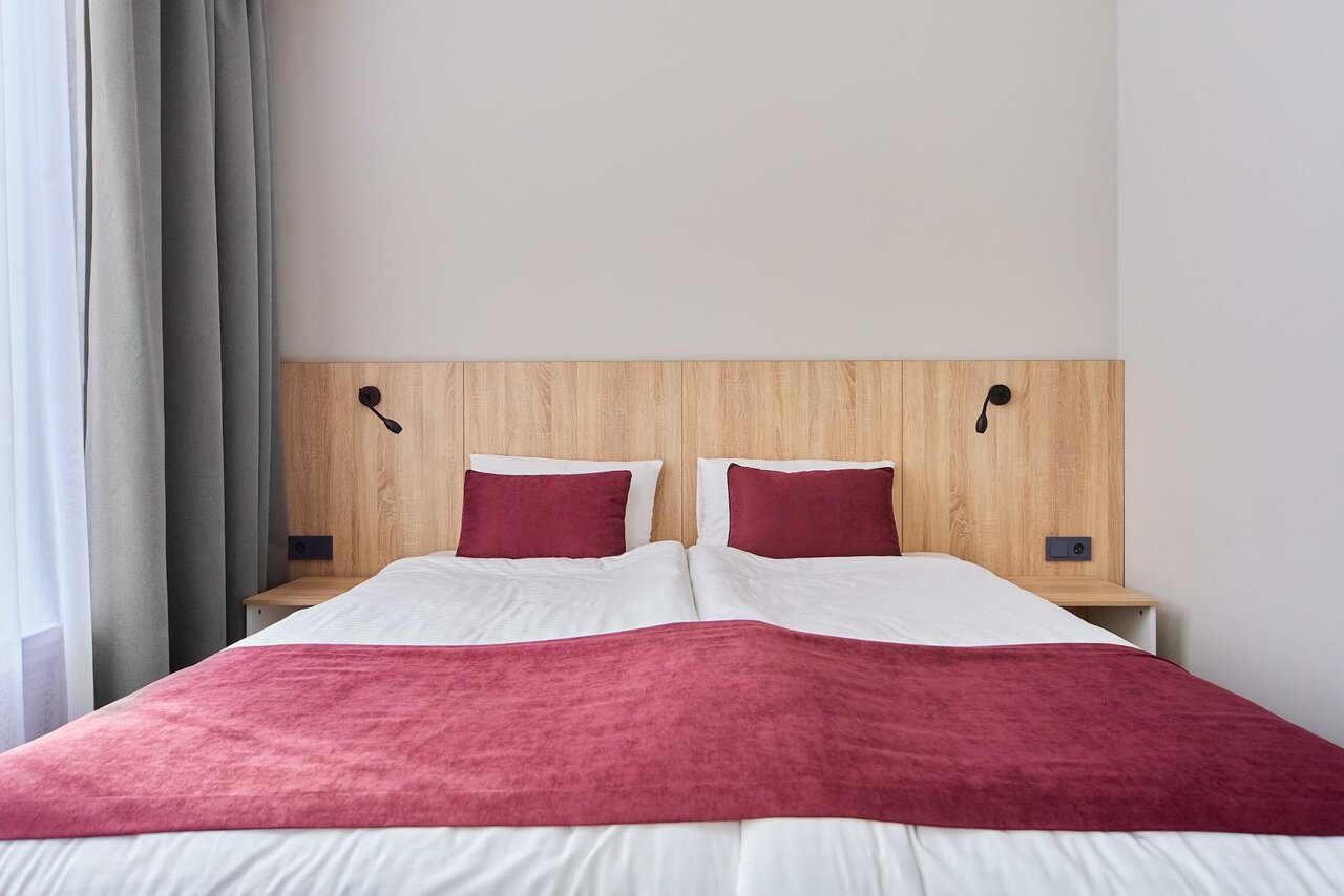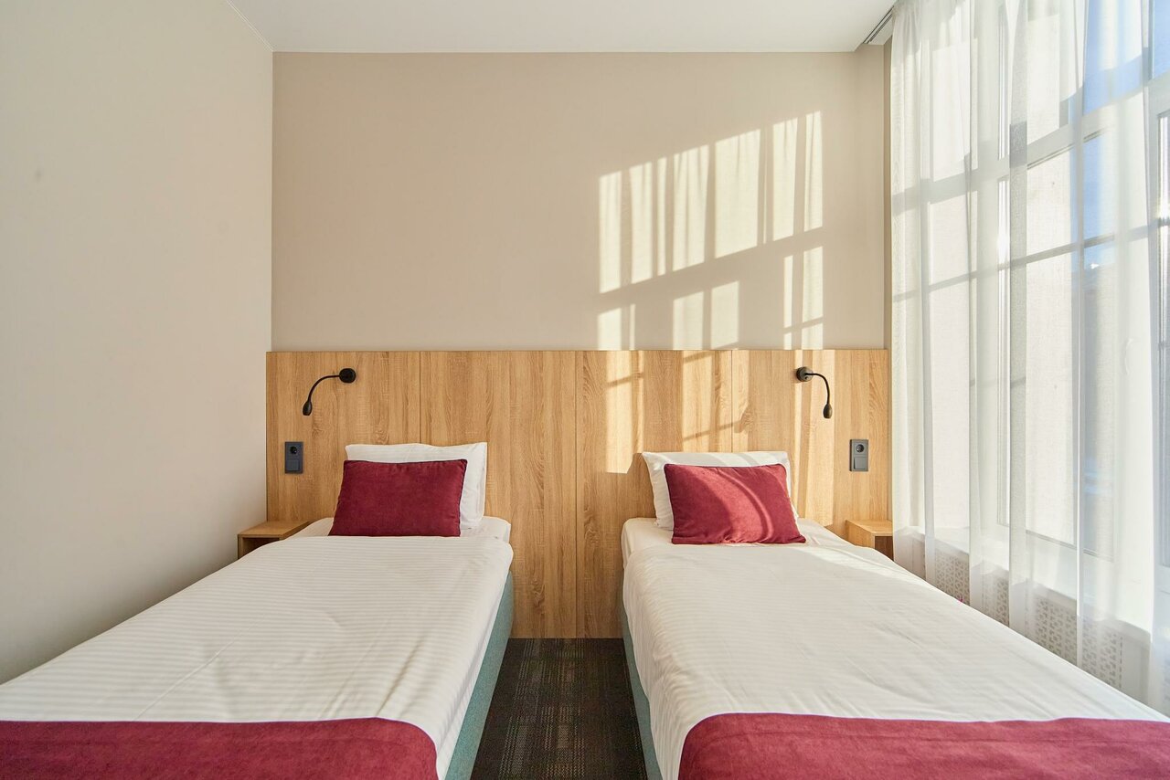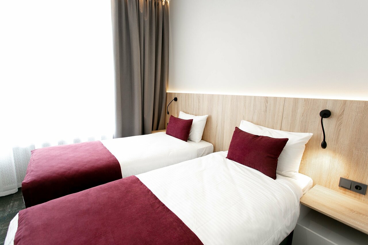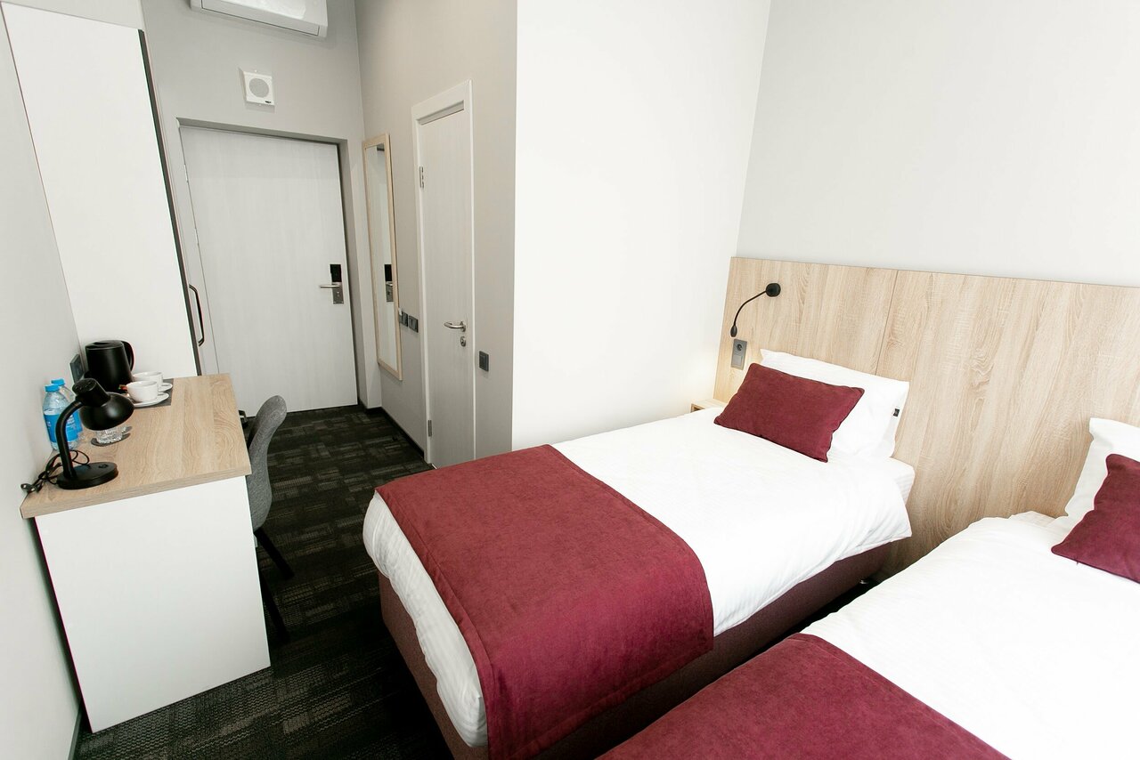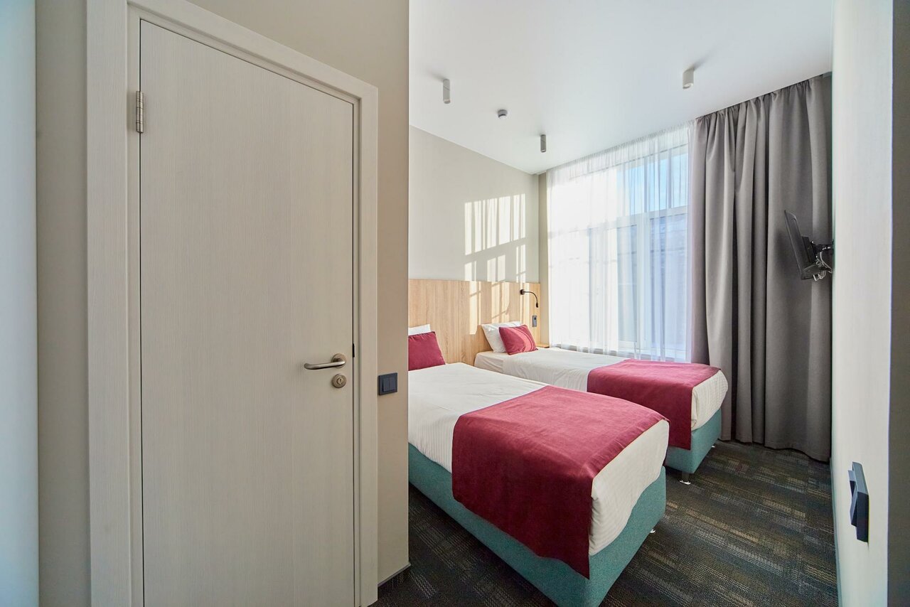 Светлый и современный стандартный номер площадью 13,5 кв.мОснащен одной двуспальной или двумя раздельными кроватями и собственной ванной комнатой с душемВ каждом номере есть рабочее место, шкаф, кондиционер, телевизор с плоским экраном, холодиль...