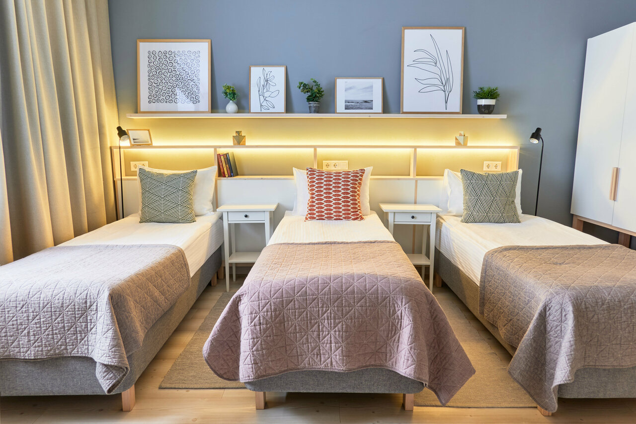 Уютный семейный номер с окнами на тихую улицу. В номере – три односпальные кровати или одна двухспальная и одна односпальная. Возможна организация дополнительного спального места.