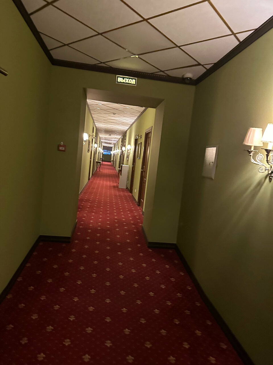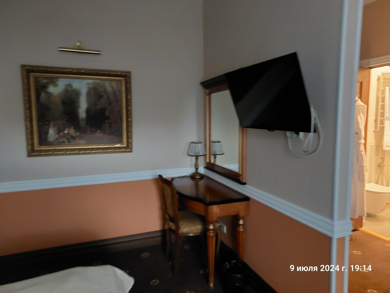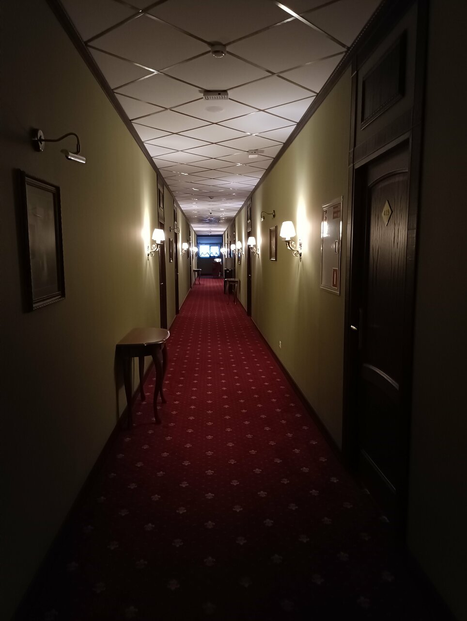 Замечательное расположение: 15 минут до Онеги, вид в перспективе по проспекту вождя пролетариата, как на крымском курорте, и при этом ты в центре города: магазины, кофейни, рестораны… Номер был в стиле убийственного ‘барококо’: четыре картины, пробуждающие в госте лёгкие эротические волнения. В предыдущих жильцах волнения дошли до точки кипения: на пол был разлит литр… вишнёвого сока, лазерная панель приведена в негодность. Номер, конечно, убрали: ковер можно было отжимать, панель имелась ещё и в спальне, кондиционер чинили на ходу. А в общем, полулюкс соответствовал уровню. Норм. Шведский стол скромный. Но в принципе тоже норм. Фотографии многочисленных ‘звездей’ на стенах убедительно свидетельствовали: заявленные отельные звёзды соответствуют.