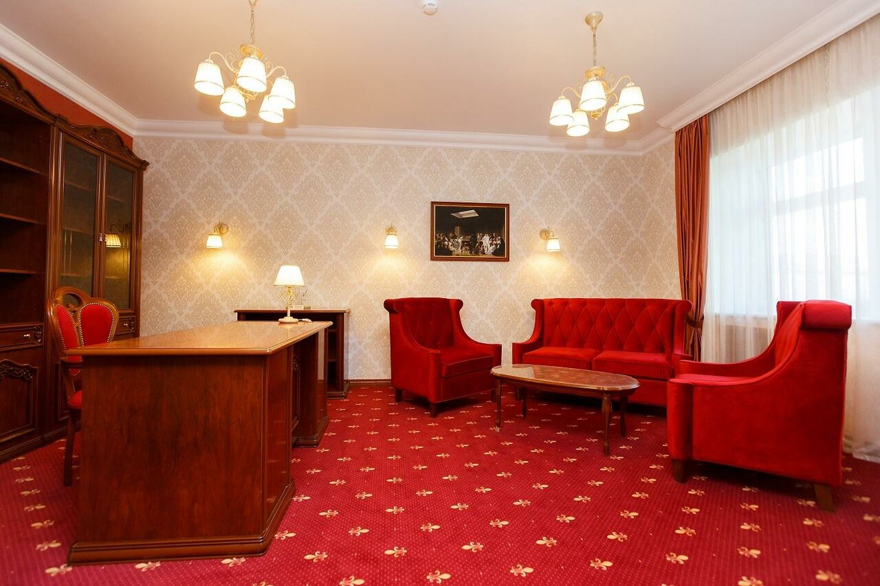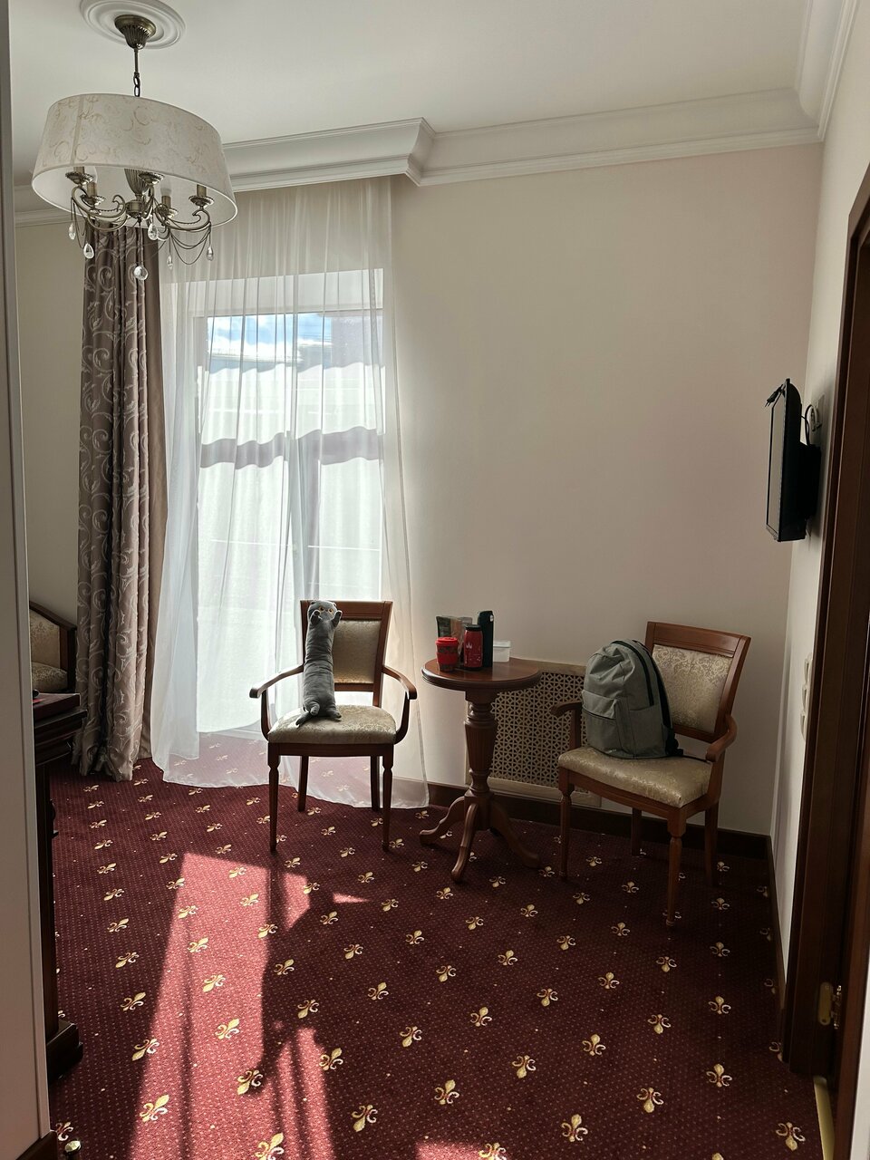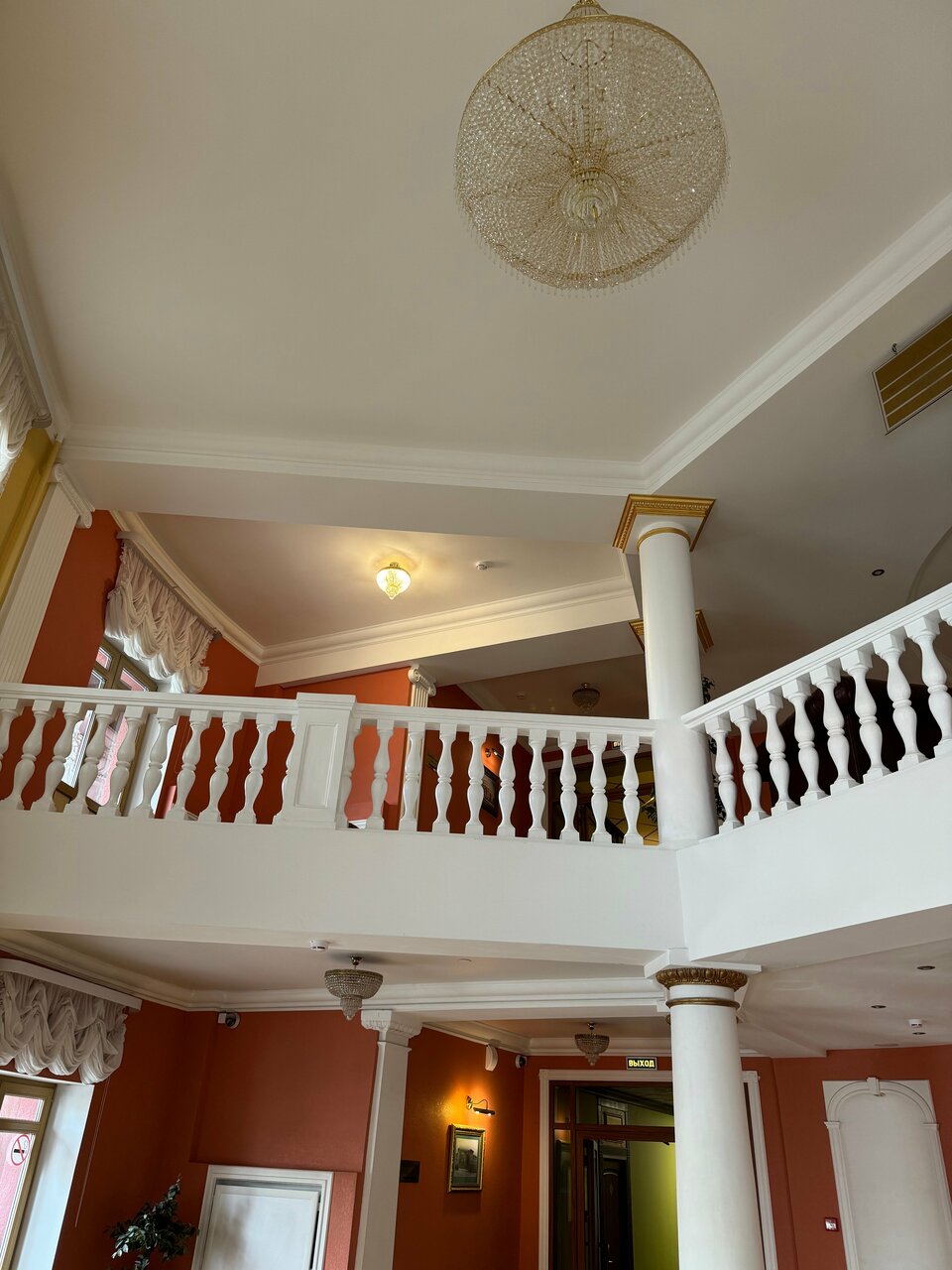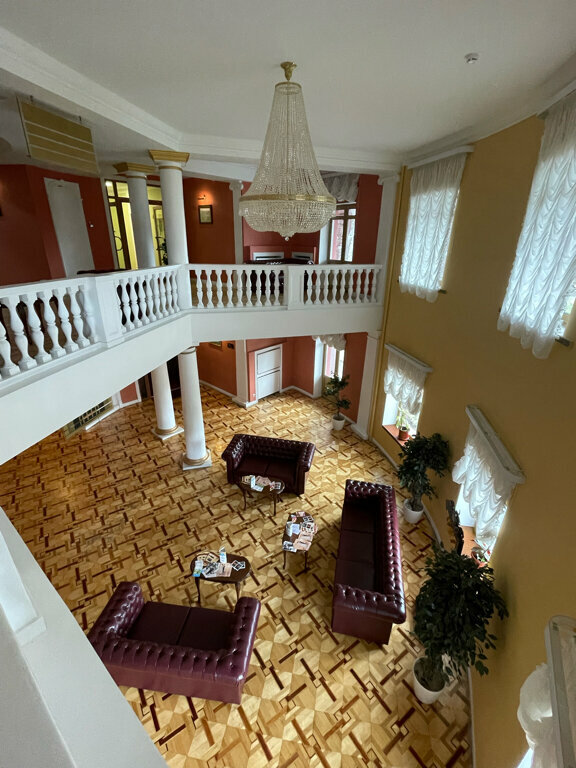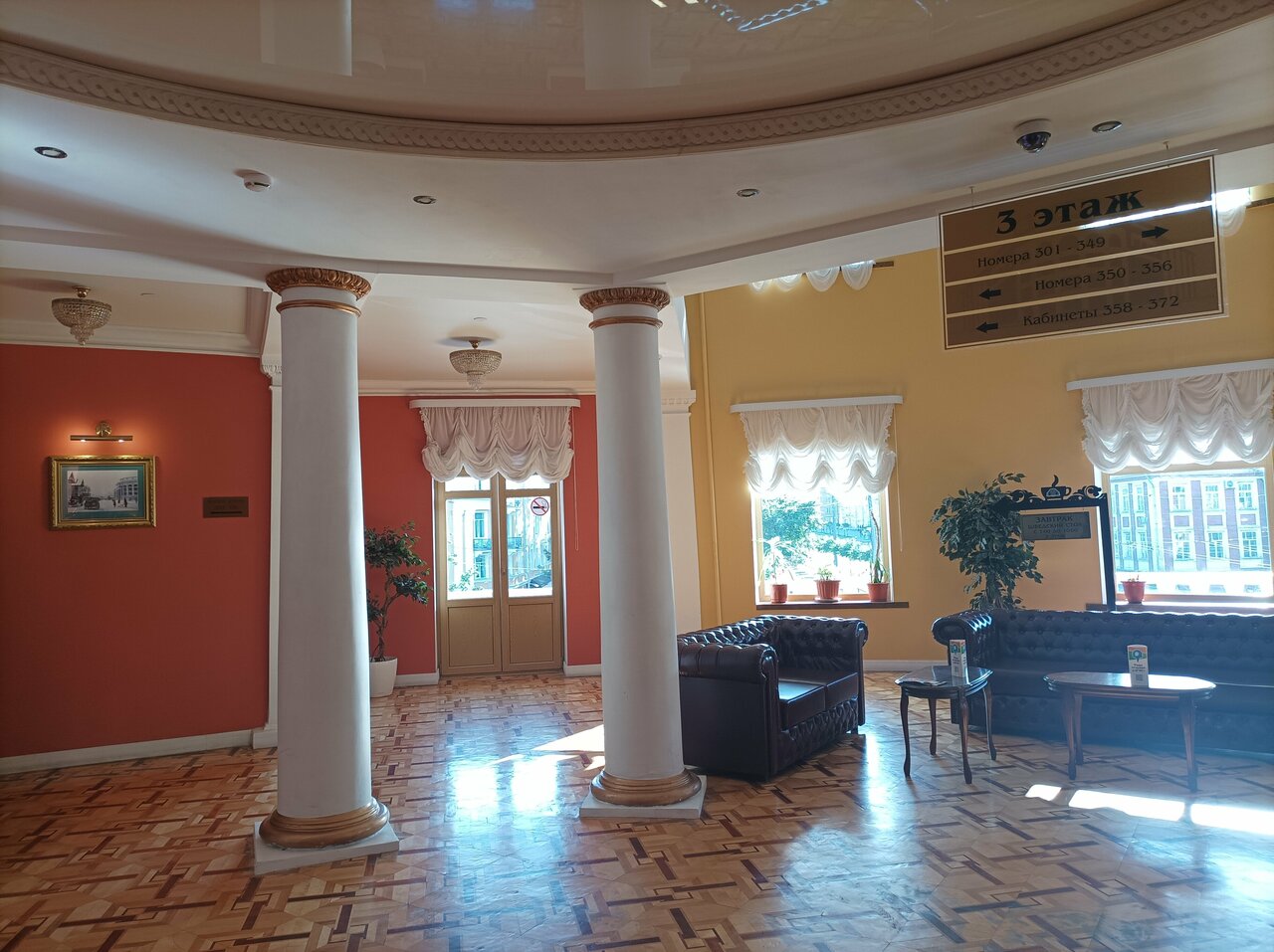 Хорошая гостиница — одна из достопримечательностей города. Очень красивые интерьеры, номера большие и чистые, цены приемлемые. Но есть минусы. Во-первых, не во всех двухкомнатных номерах есть дверь между комнатами, хотелось бы, чтобы это было указано изначально в описании номера! Не хватает кулера с водой в коридоре, приходится набирать воду из-под крана. Ещё не самые лучшие завтраки, они, конечно, нормальные, но каша, например, вообще непонятно какого качества, колбаса также, сливочное масло! В общем хорошая гостиница, но есть несколько нюансов!