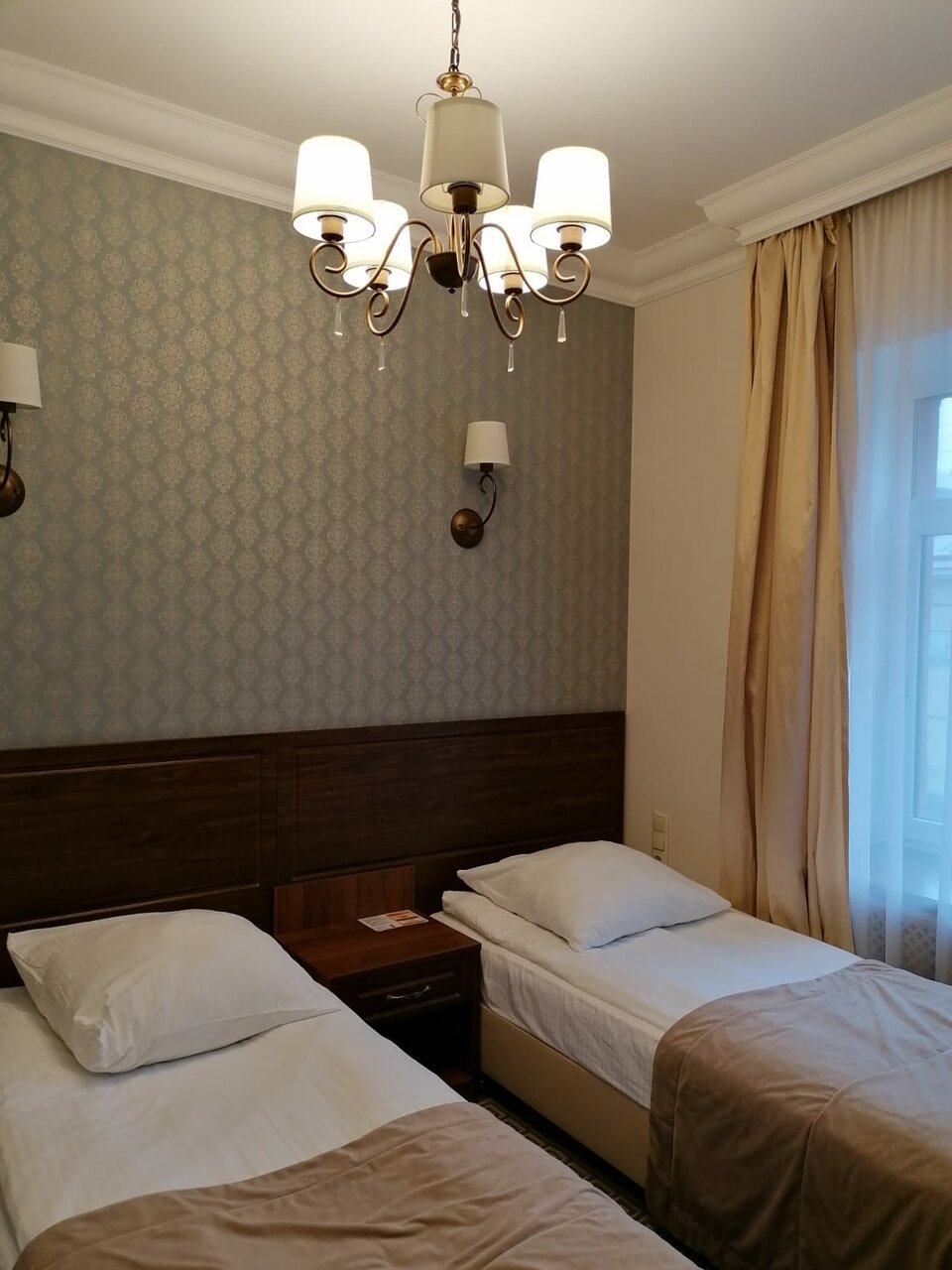Очень понравилась гостиница, историческое довоенное здание было восстановлено после войны. Отличное расположение в центре, везде близко. Номера комфортные, твин отличный, не тесный, чистый, все есть. Кровати, матрасы отличные, белье нормальное. В номере были халаты и тапочки, все гигиенические принадлежности, а также чашки, стаканы, чайник, пакетики чая, сахар, ложечки. Единственный относительный минус — завтраки, бездушные какие-то, совсем без изюминки и фантазии. Зато кофе в кофе машине натуральный.
