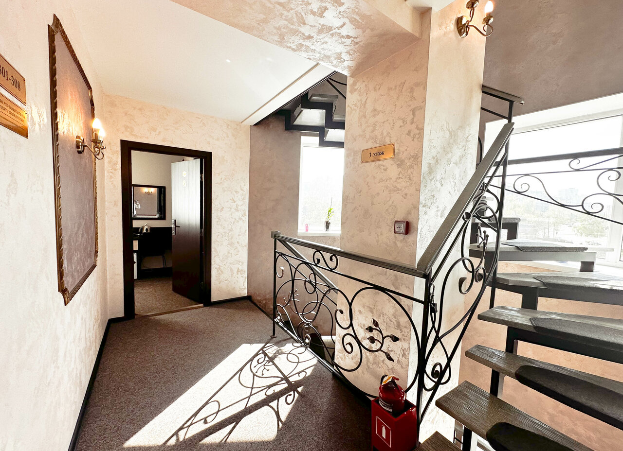 Я не знаю, кто согласовал эксплуатацию этого сооружения как гостиницы. Где пути эвакуации при пожаре? Одна задымляемая лестница с забежными ступенями эвакуационным выходом не считается, второй лестницы нет вовсе. Находится ‘отель’ в спальном районе, благоустройство и инфраструктура отсутствует. Буфет для завтраков не рассчитан на количество постояльцев. Номера относительно новые и чистые, к персоналу вопросов не было.