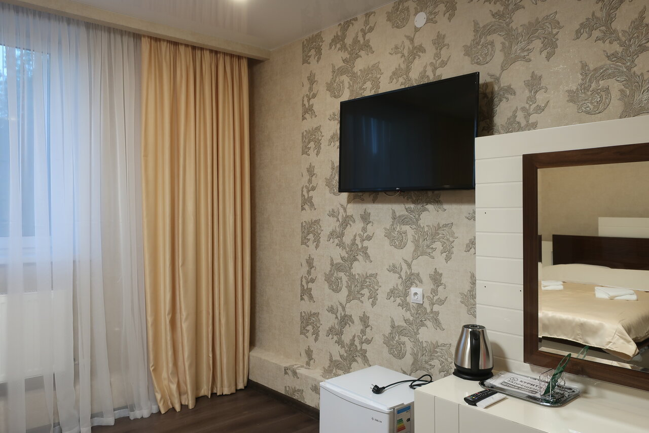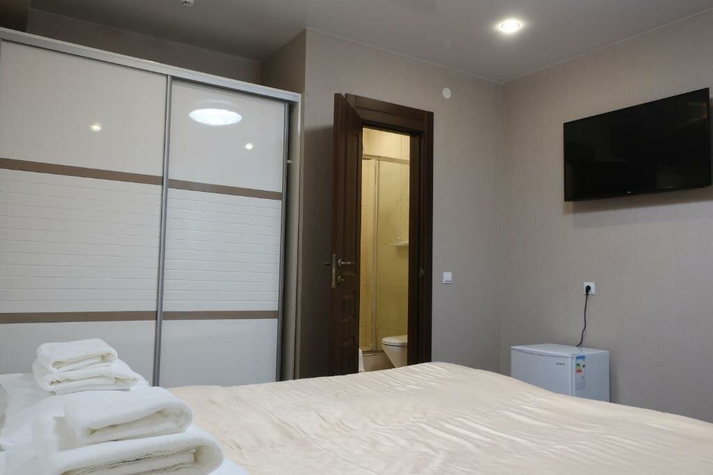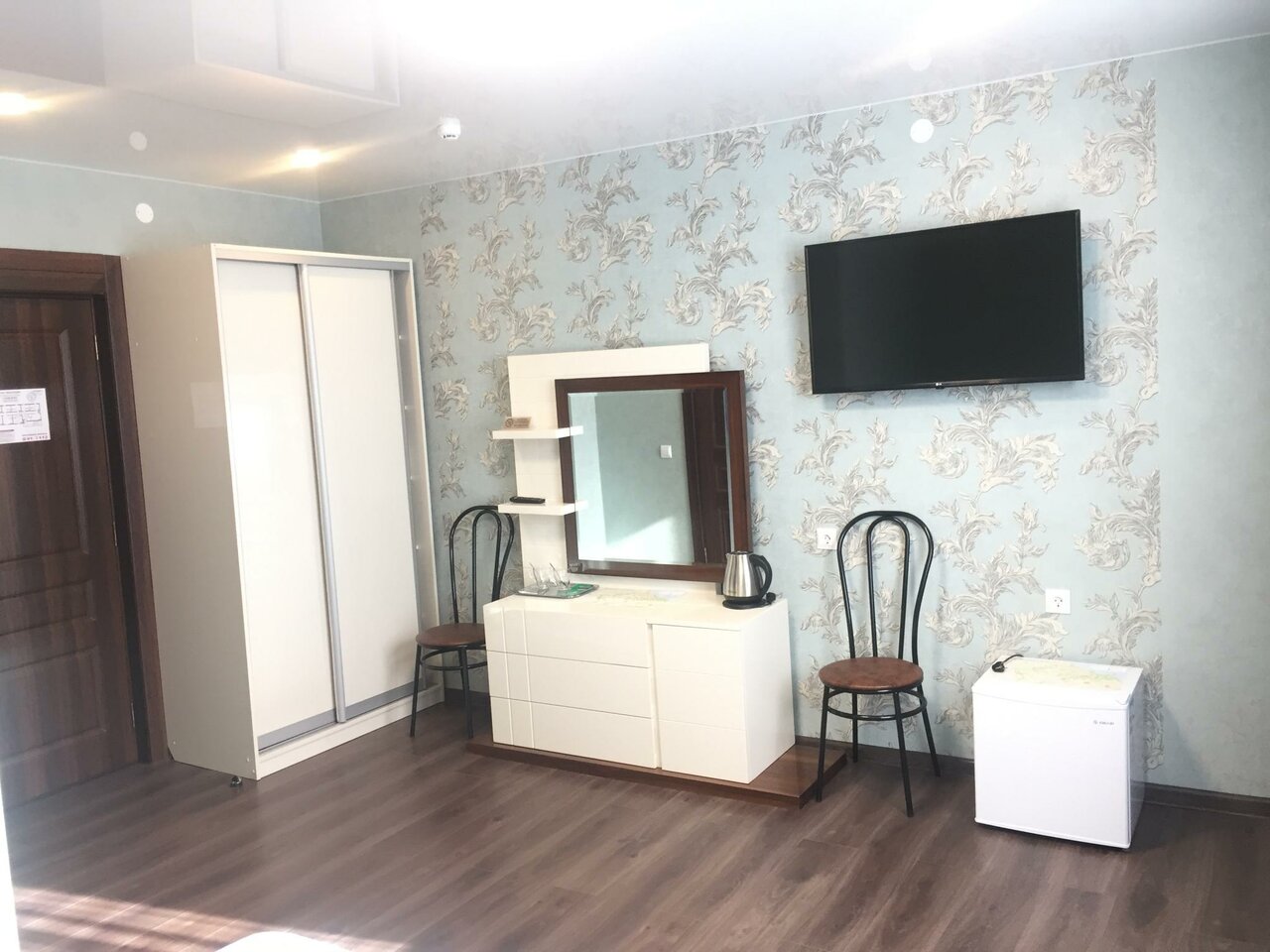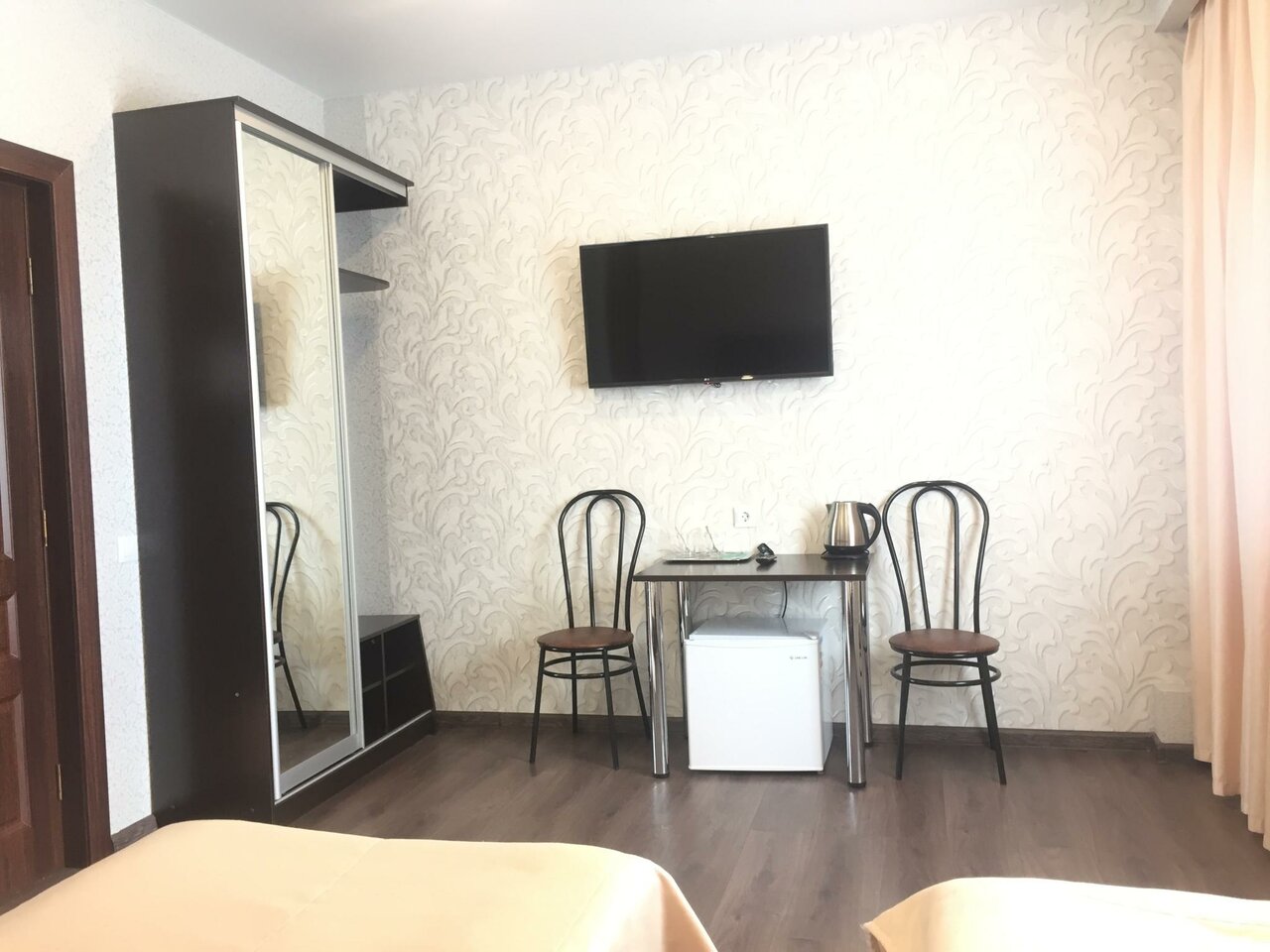 Уютный, просторный номер. Вход у меня был отдельный. В номере кухня, спальня, душевая, туалет. Телевизор есть на кухне и в спальне а так же в гостинице есть Wi-Fi. На территории отеля имеется уютный ресторан. Большая, хорошая парковка. Любой вид оплаты.