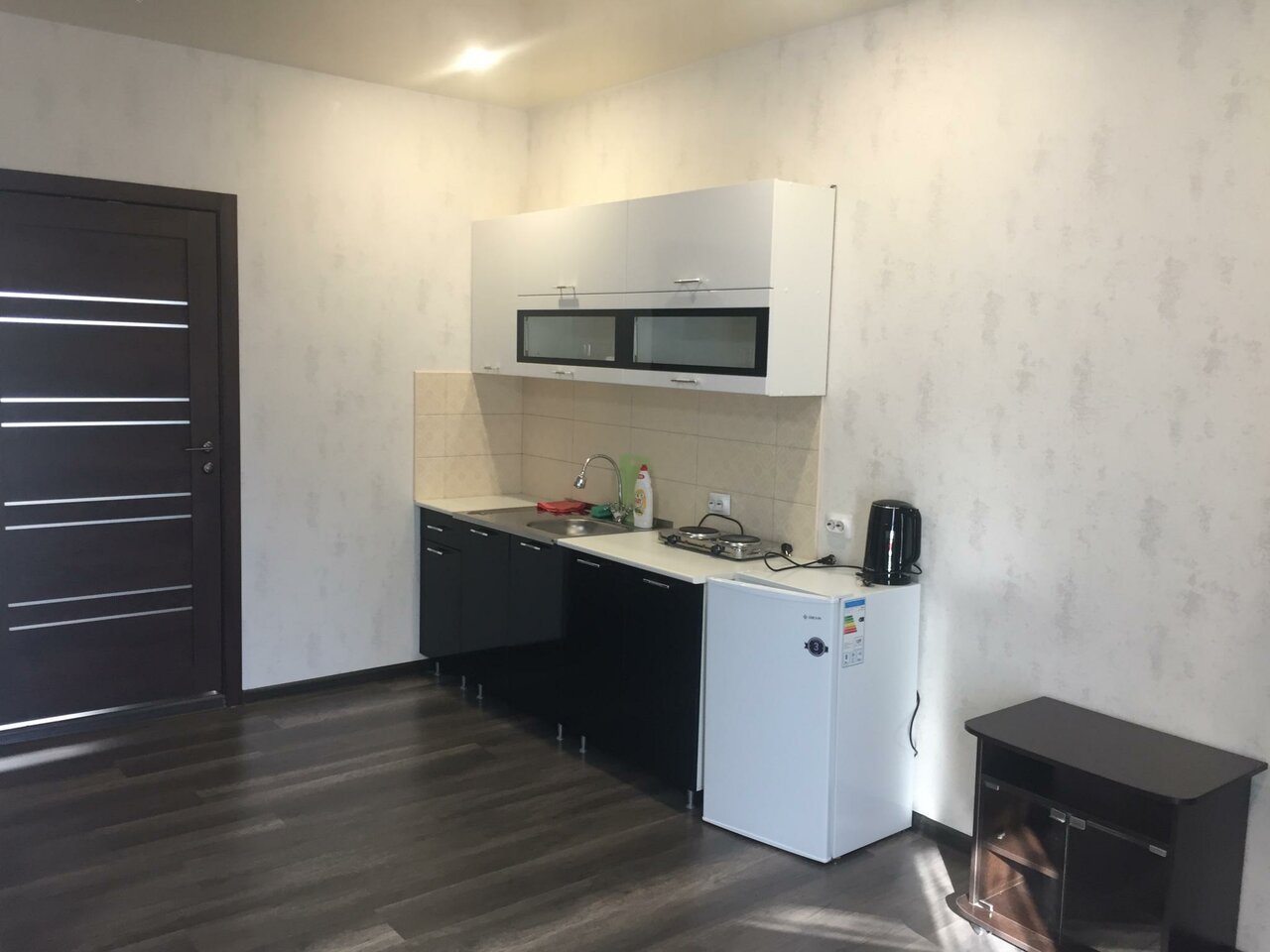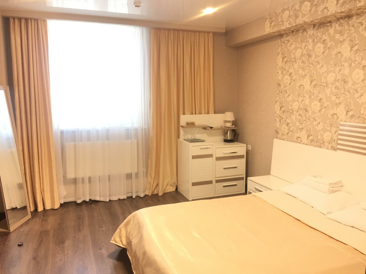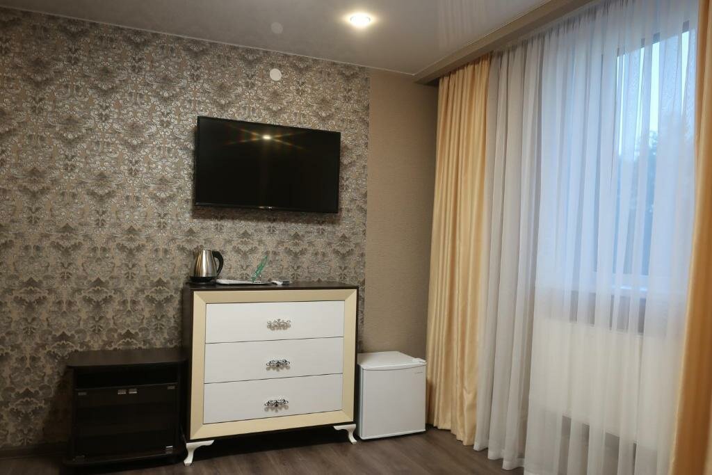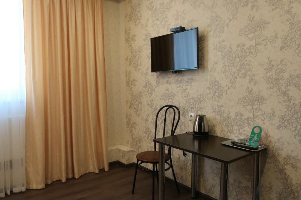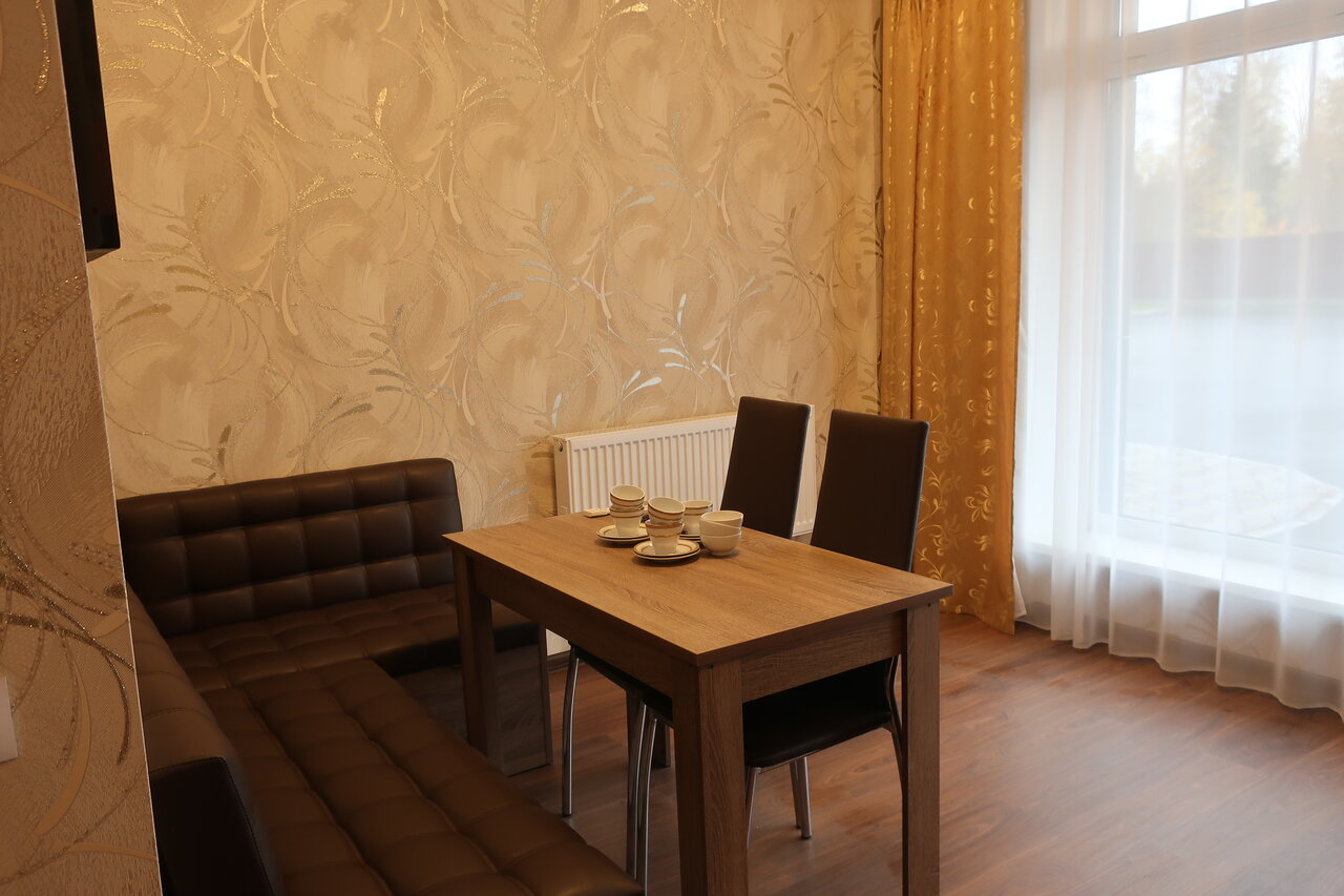 Уютный, просторный номер. Вход у меня был отдельный. В номере кухня, спальня, душевая, туалет. Телевизор есть на кухне и в спальне а так же в гостинице есть Wi-Fi. На территории отеля имеется уютный ресторан. Большая, хорошая парковка. Любой вид оплаты.