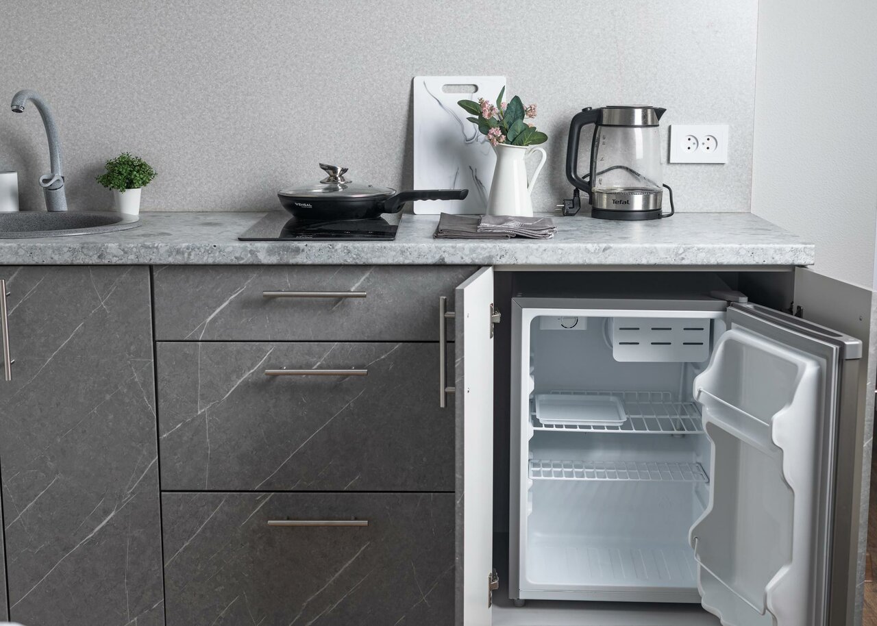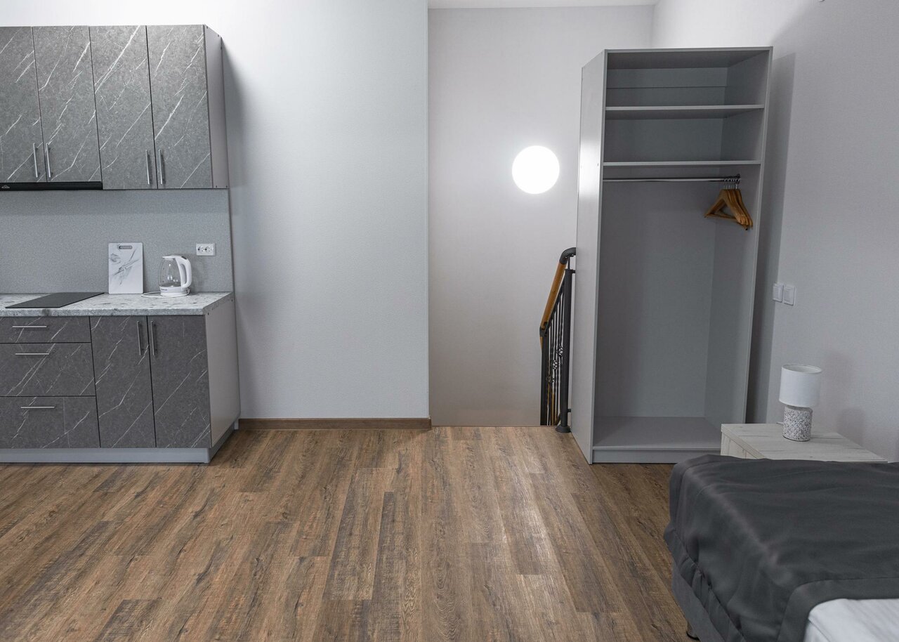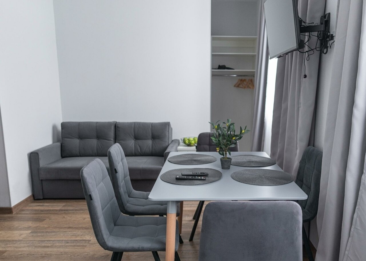 Прекрасные аппартаменты. Всё новенькое, чистенькое, подобрано в одном стиле. В номере есть всё необходимое — холодильник, плита, посуда, микроволновая печь, фен, утюг, гладильная доска. Очень приятные хозяева, всегда были на связи. Удобное расположение для тех, кто на автомобиле — во дворе парковка. В 10 минутах ходьбы торговый центр и большой гипермаркет сигма 24 часа.