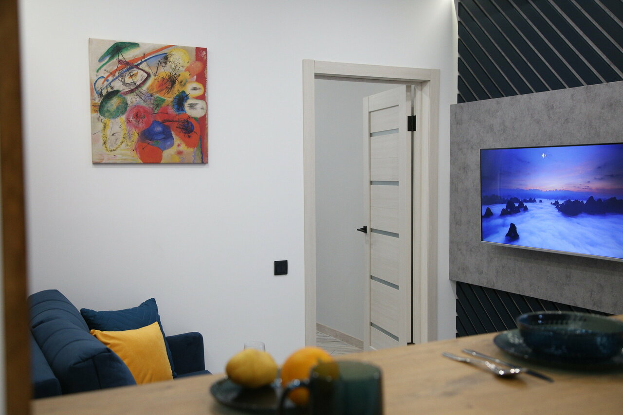 Добро пожаловать в сеть апартаментов «Художники» Данные апартаменты носят название «Кандинский», его репродукция присутствует в деталях интерьера, надеемся выбор картины этого живописца вам понравится.