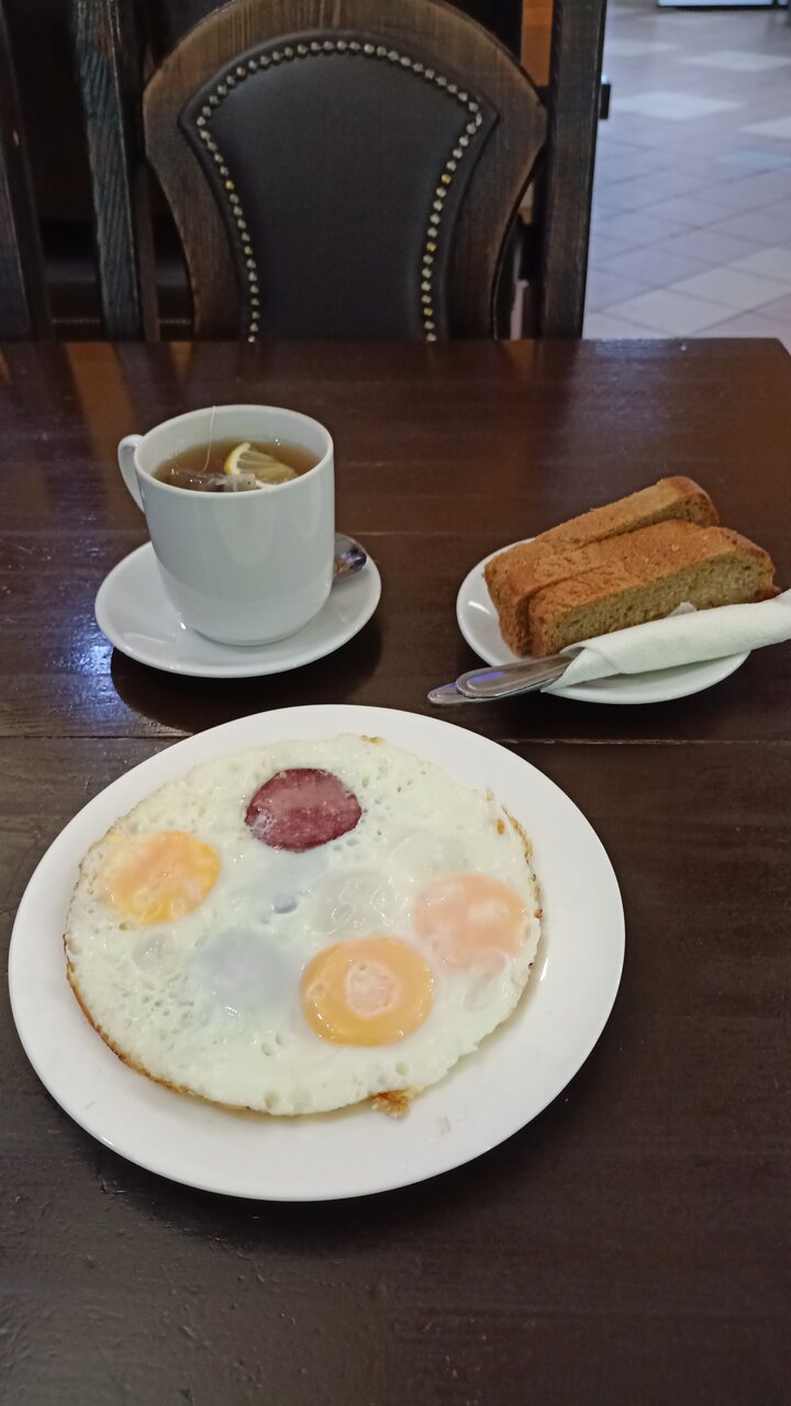 Заехали позавтракать в кафе. Быстро, вкусно, цены вменяемые. Есть гостиница, много народу ночует