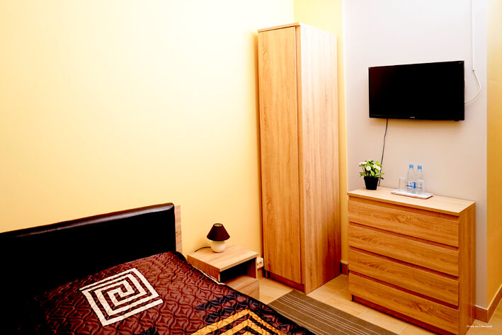 Это хостел с общим санузлом, душевой и некоем подобии кухни, где можно только разогревать продукты, готовить нельзя. Если Вы в командировке и планируете жить в этом отеле пару дней — то это терпимо, если более то стоит задуматься. Номера чистые, убирают ежедневно, персонал приветливый. Еду можно покупать в соседнем магазине и разогревать в микроволновке в отеле.