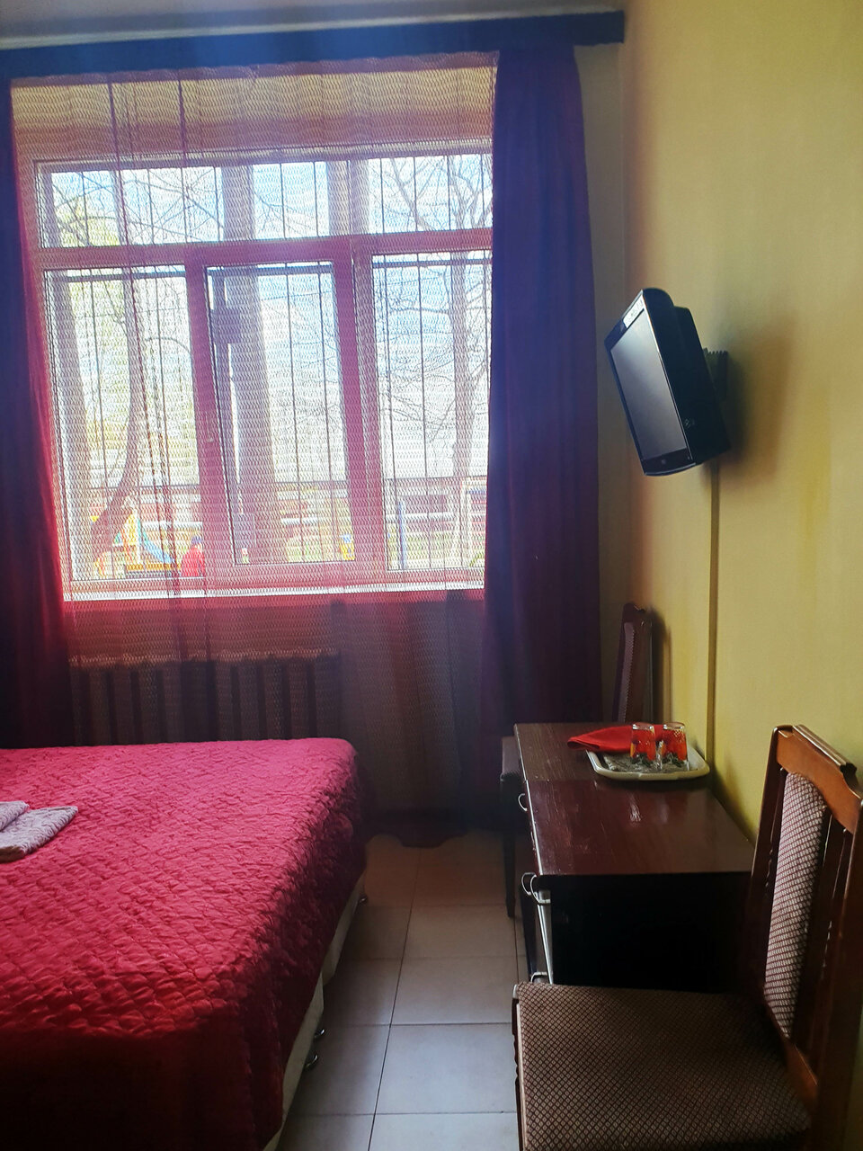В номере куча комаров, искусали до жути. Постель прожжена. Заклинила дверь, ждали пока откроют 25 минут, при условии что мы должны были выехать в 8 утра. Администратор вызывал мчс, сказали что выезд стоит 6.000 рублей, после чего администратор отказался от вызова.Тоесть грубо говоря по мнению администратора наши жизни не стоят и 6к. Выбраться кроме как через дверь никак, на окнах решетки от которых ключей нет. Про правила пожарной безопасности можете забыть.Холодильник работает как трактор Кран ходит ходуном. Не заслуженная 1 звезда.
