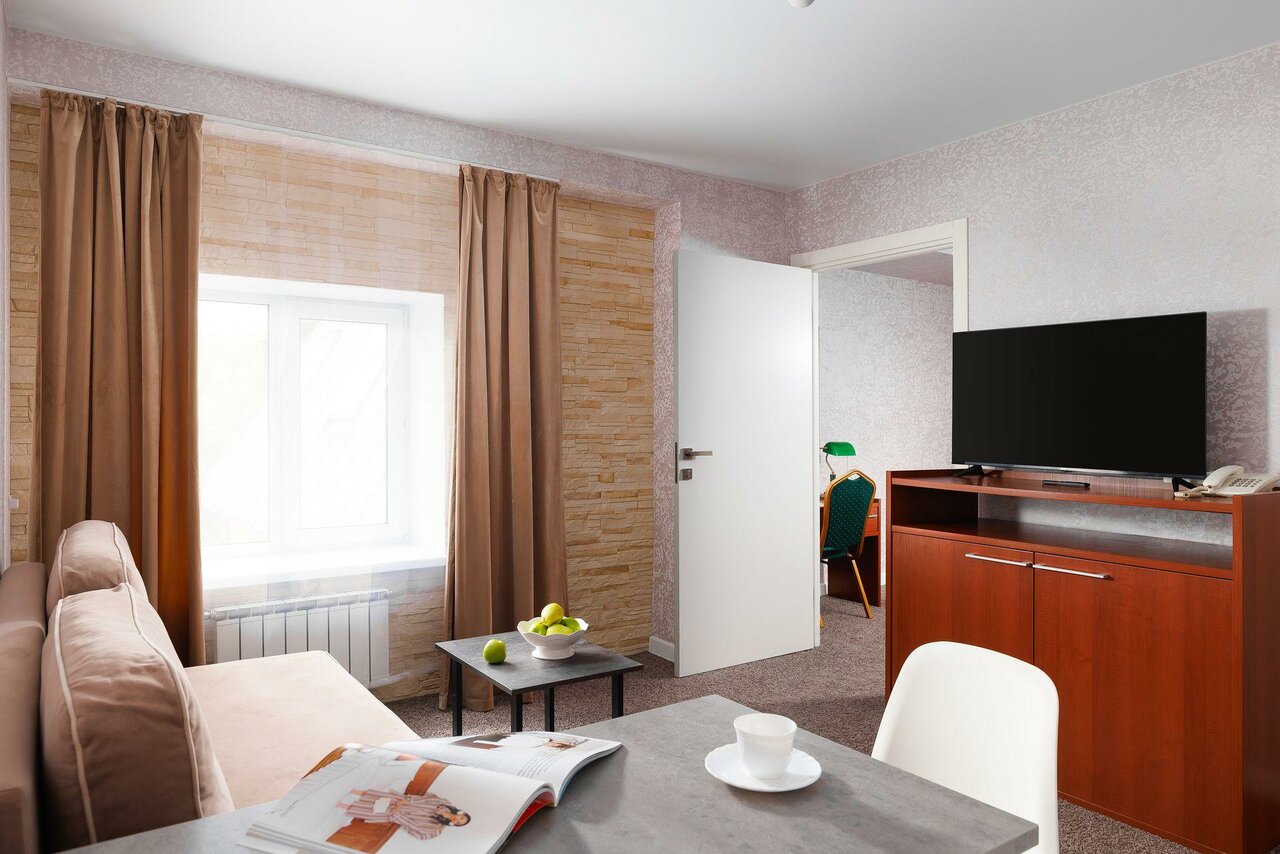 1-2 человека - 6500р/сутки, 3 человека - 7000р/суткиДвухкомнатный Люкс - две комнаты с комфортными условиями (32 м²), две двуспальные кровати, завтрак каждый день, номер для некурящих