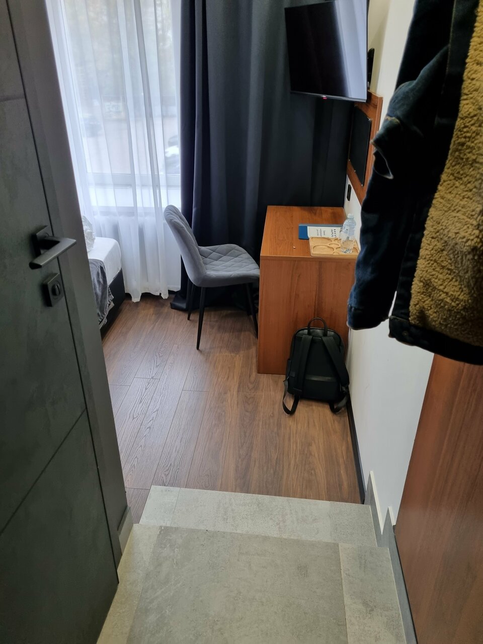 Приятно удивлён, все недостатки исправили, плесень убрали, лестницу подсветили, завтраки сделали путём договора с ближашим заведением — ранее писал: Из недостатков: нет завтраков, лестница посреди комнаты (ночью в темноте можно ноги переломать), плесень на окнах, шум с улицы — окна на дорогу. В целом, персонал старается, чисто, всё необходимое в номере есть.