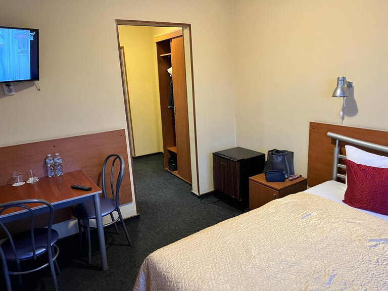 Одноместный номер.. — чистенько, мебель нормальная, телек плоский и большой, есть маленький холодильник, сейф.. каждый день меняют полотенца и шампунь/гель для душа в пакетиках.. НО, нет в номере и на этаже ни чайника, ни микроволновки.. рядом с гостиницей есть ‘Магнит’ (следите что вам пробивают- приписали +900), есть кафешка с шаурмой/пельменями и пончиками.. есть бесплатная парковка
