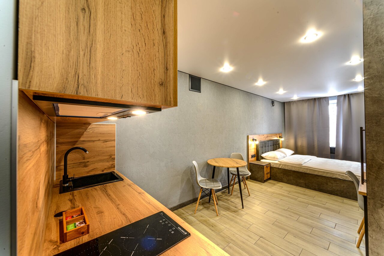 - Наличие кухни в номере.; Наличие всей необходимой посуды и бытовой техники (плита, чайник, холодильник).; Удобные и комфортабельные номера.; Приятный интерьер и современный дизайн.; Доступные цены за предлагаемый уровень сервиса.