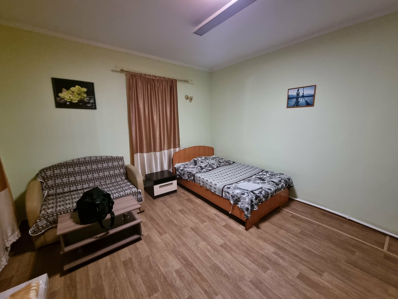 Заехали переночевать,сняли 2 номера,на втором этаже,оказывается там уже была женщина-постоялец,хозяин этого,,отеля,, нас не предупредил. Нас четверо мужчин,в трусах,в душ-туалет ходим туда-сюда. Кстати, туалет не работал,смывали графином. Всем кто будет заезжать,проверяйте при хозяине. Просто переночевать можно. Цена номера 1000 рублей. В номере микроволновка, чайник,обогреватель. Воду берите с собой,вода местная вонючая