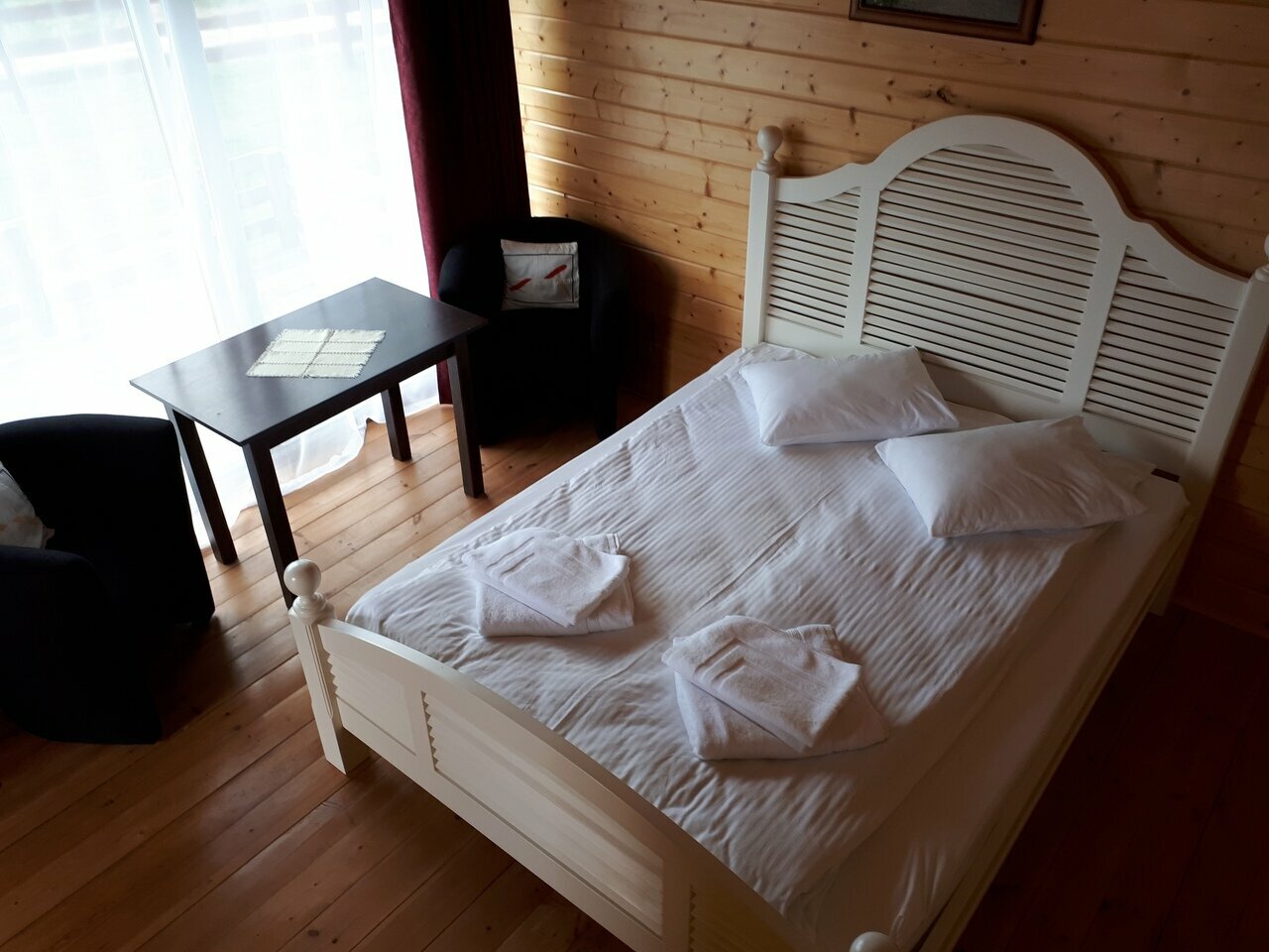 Замечательный ресторан, шикарная кухня, завтраки, вид, обслуживание. Все что касается ресторана и самого места (мало где можно вкусно пообедать с видом на Литву) строго рекомендую, но вот домики, сдаваемые в аренду, на мой взгляд очень запущены. Непонятно почему нельзя повесить шторы, которые будут не меньше окна, или поставить мини холодильник, цена которому 5-7тр. И таких вопросов к проживанию у вас возникнет много.