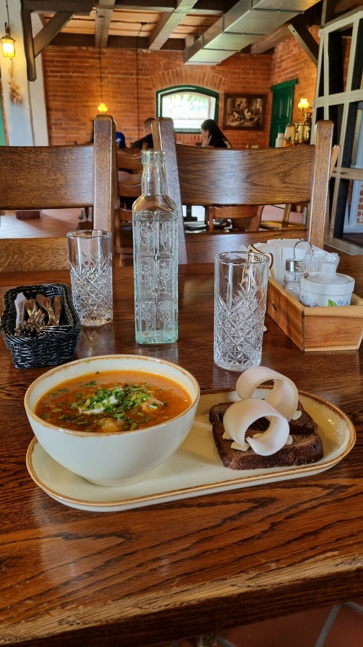 Ездили на автобусную экскурсию ‘Тильзит-Рагнит’, и привезли нас сюда на обед. Комплексный обед за 800 рублей состоял из борща без единого кусочка мяса на первое и большого количества картошки с тремя мелкими шматками свинины на второе. Да, был ещё ‘сезонный салат’ из капусты и огурцов. Мне казалось, что в июле можно было и помидоры туда положить…Плюс разбавленный морс. Красная цена такому обеду 300 рублей, в любой столовой было бы лучше. Хозяева просто пользуются тем, что у экскурсантов нет времени искать более достойное место.
