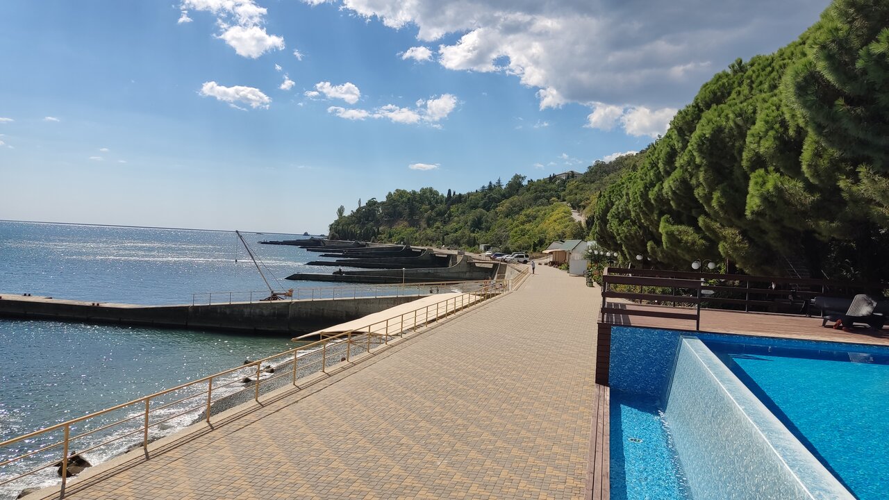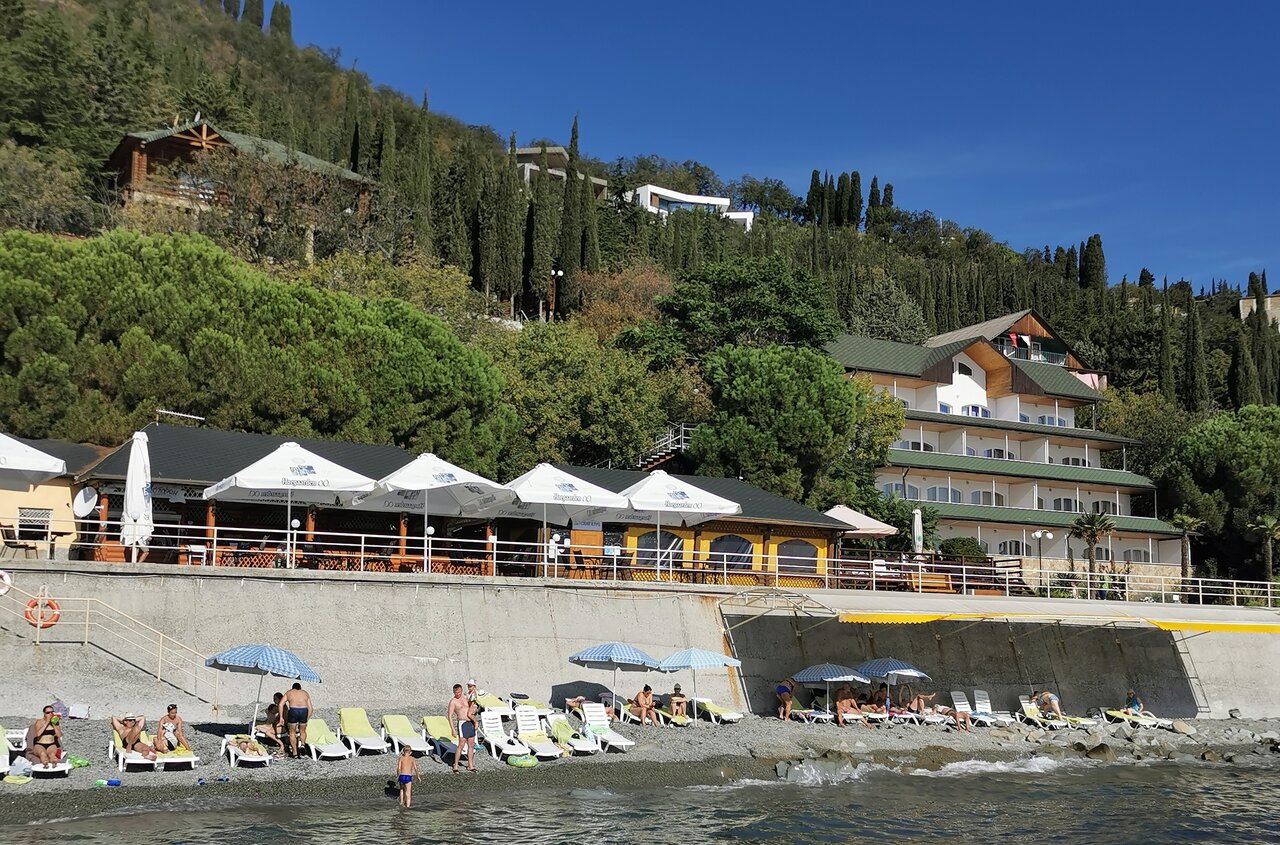 У меня был чудесный номер с видом на море, еда в столовой — просто чудо Если относиться к ступенькам как к тренировке тела и духа, с ними можно смириться Там очень красиво, много кипарисов,чистейший воздух, хорошее море Очень внимательный и приветливый персонал Мне понравилось