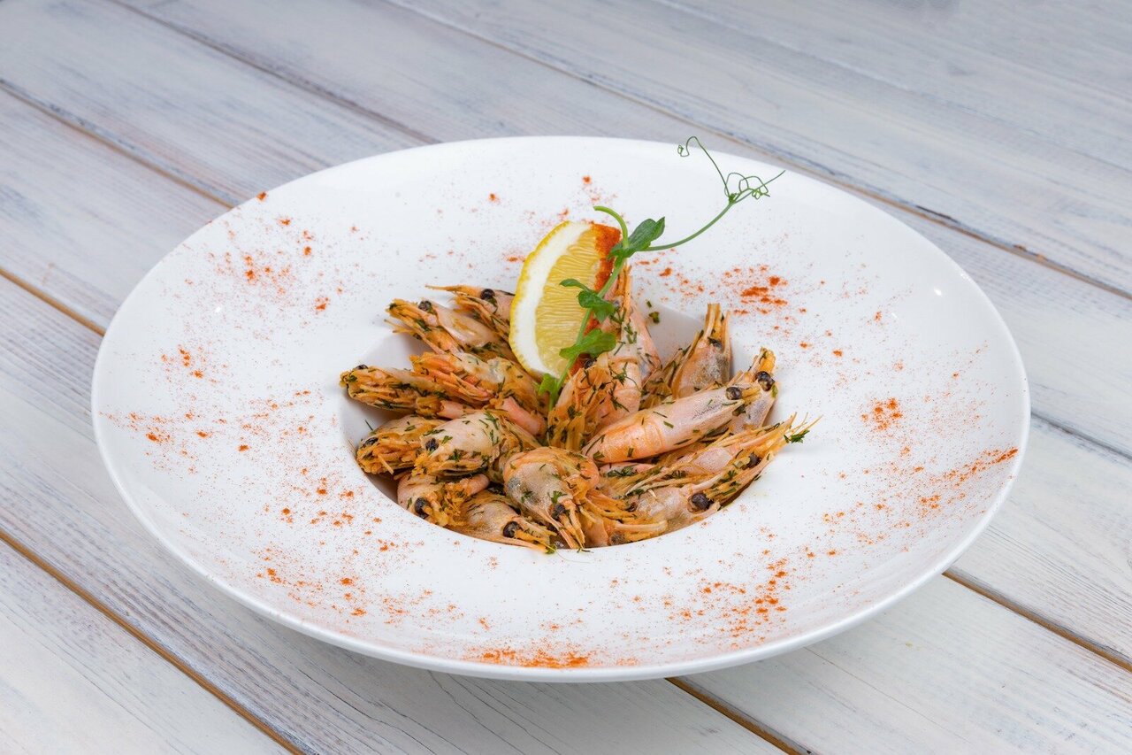 - Вкусные блюда в ресторане (кальмары, фаршированные креветками).
