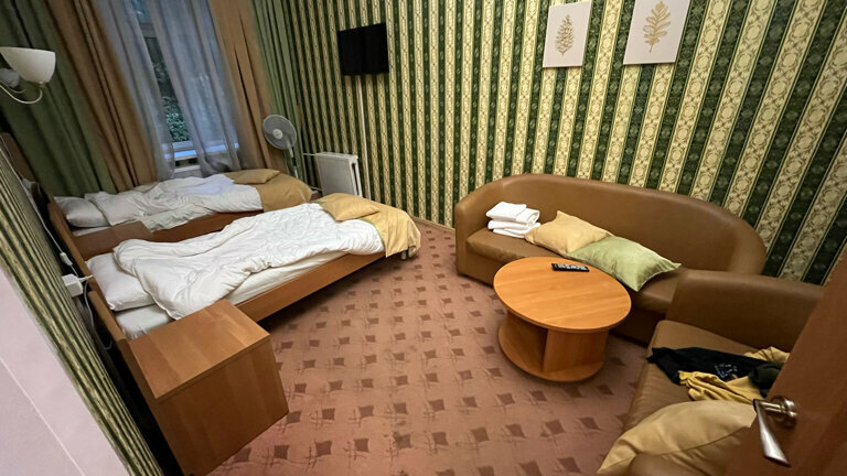 Чисто, тихо, вкусно кормят, горячая вода, телевизор, холодильник, но … плохая канализация (запах), отваливающиеся розетки (и их неудобное размещение: или холодильник включаешь или телевизор) Из плюсов: удобно добираться до центра столицы.
