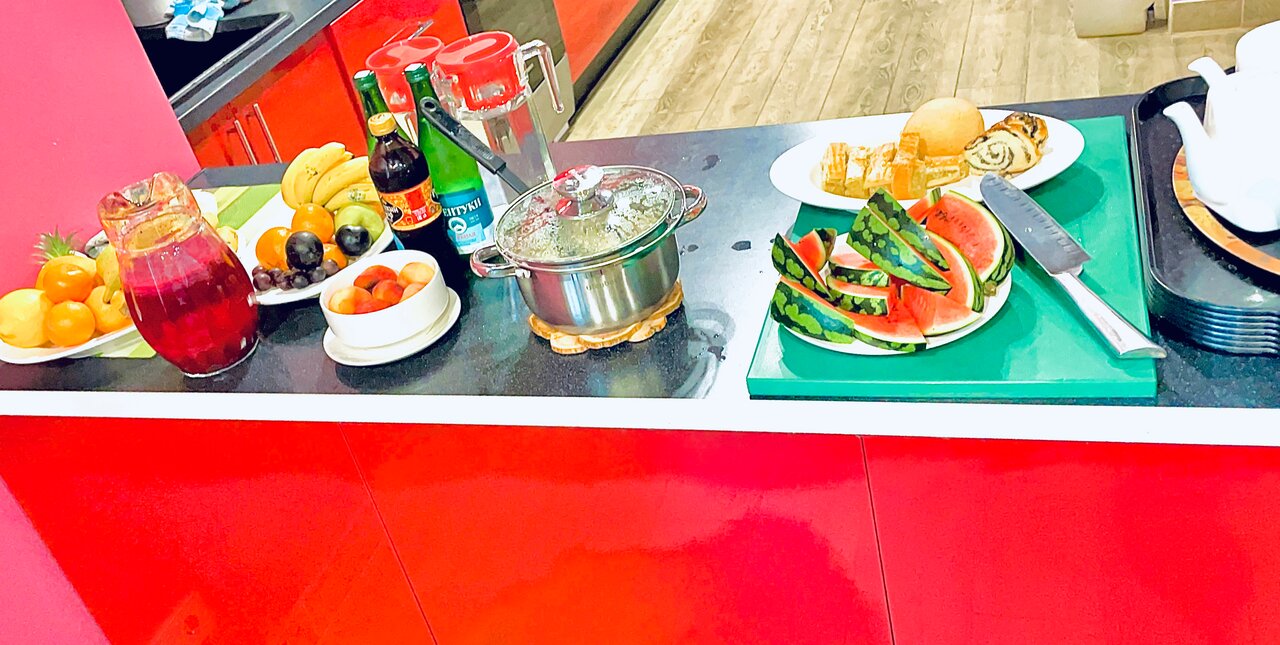 - Большая общая кухня с полным набором посуды и техники (кофемашина, микроволновка, электрогриль и др.).