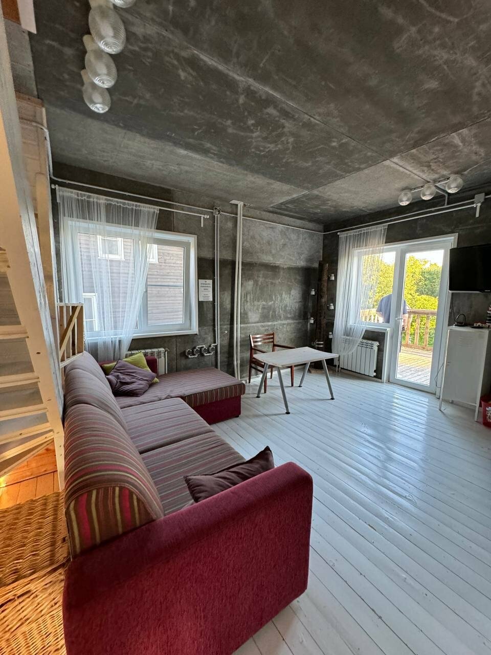 Приятное место , хорошие хозяева , все удобства включены , все сделано для комфортного отдыха , есть парковочные места ! Приятная гостиная. Из окон виден лес !