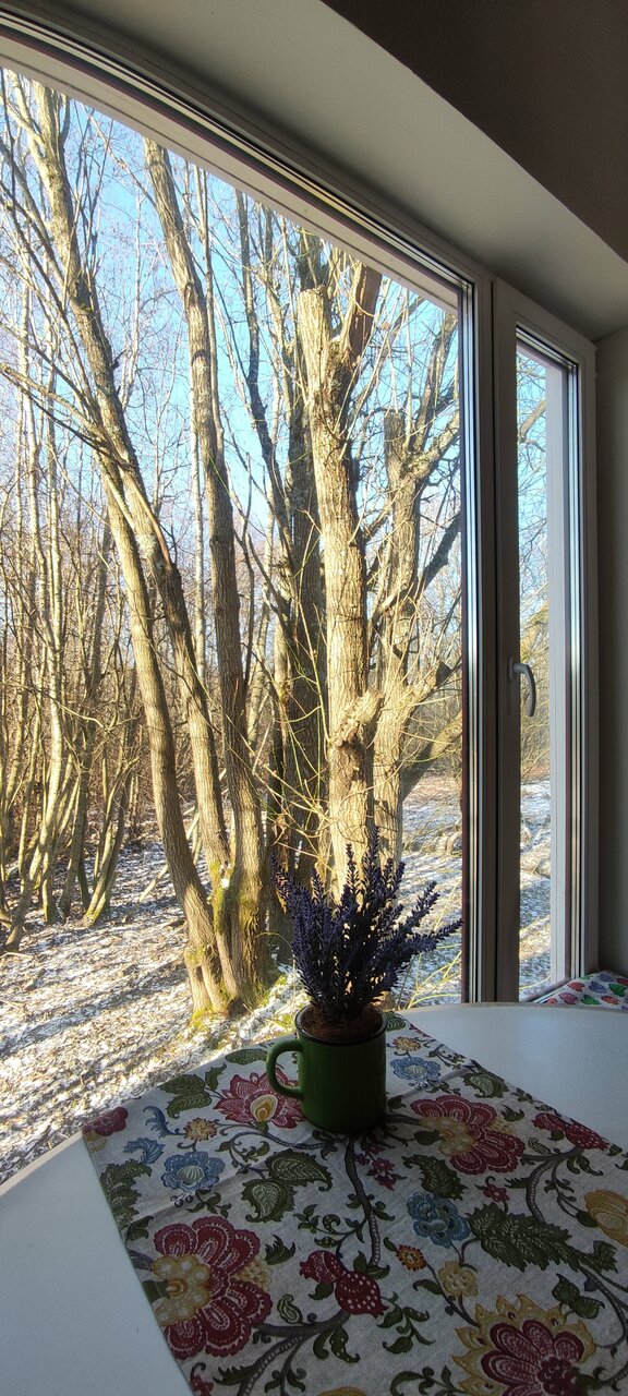 Уедененное место, красивый со вкусом интерьер камин и баня, лес за окном, нехватает простора вида из окна прямо вплотную деревья но тоже красиво