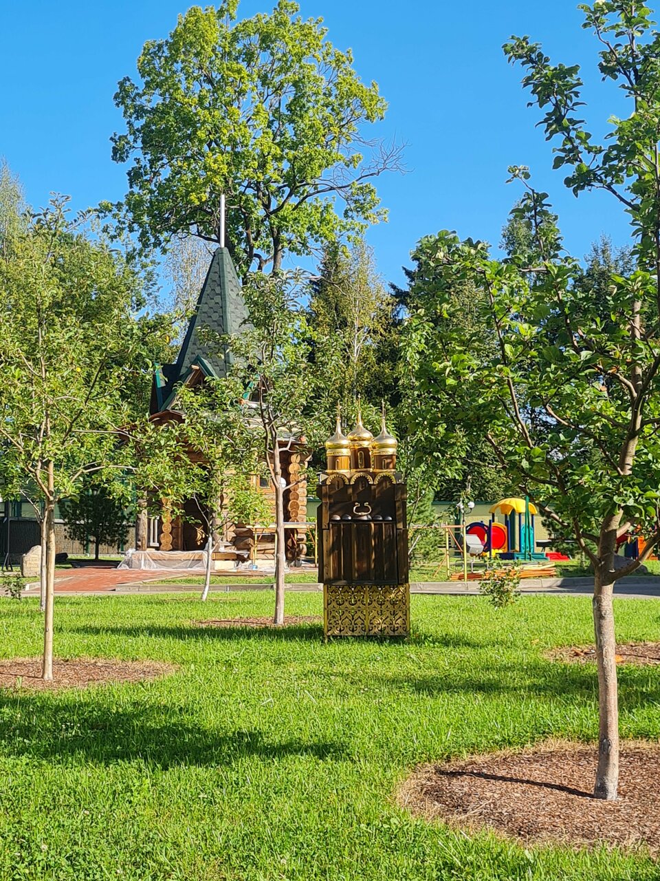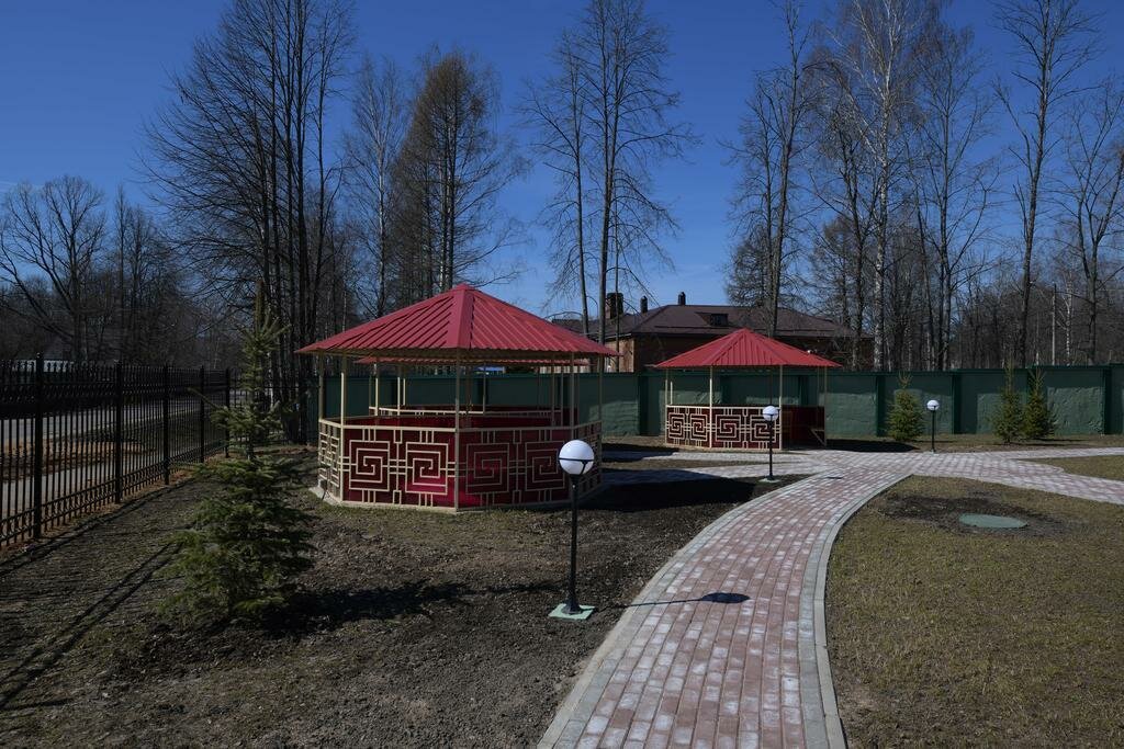- Красивая зелёная территория с беседками, качелями, прудом.
