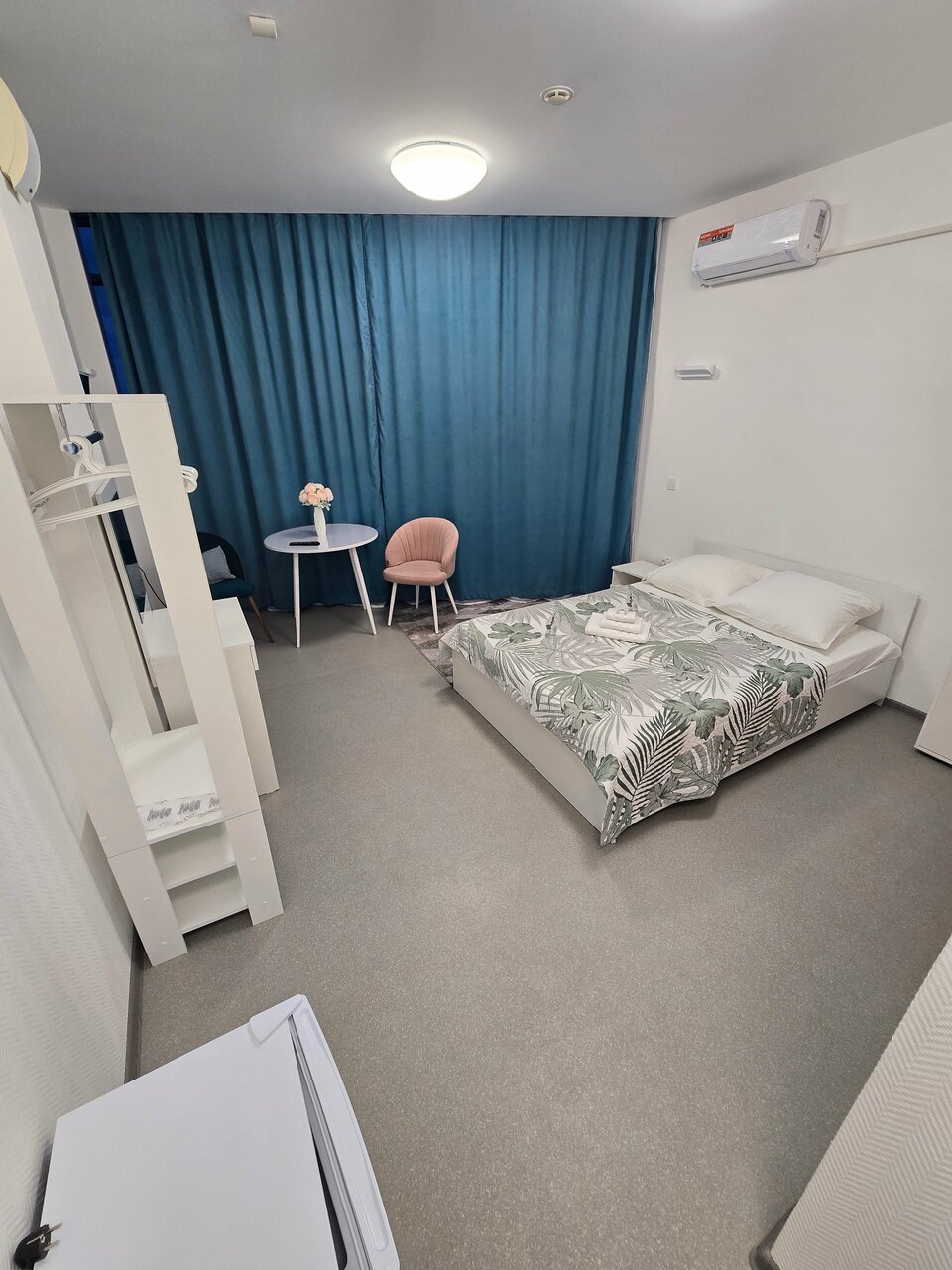 номер площадью 18 м. кв. широкая 2-х спальная кровать с ортопедическим матрасом, компьютерный столик, ТВ, кондиционер, зеркало, шкаф,