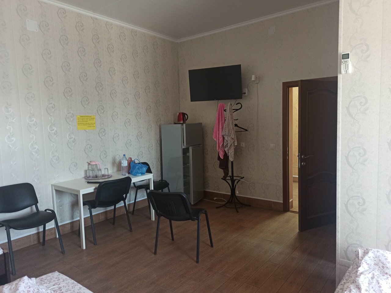 Из плюсов — был свободный номер, холодильник, кондиционер и зачем-то фен для волос. Из минусов: нету геля, шампуня, даже мыла. Стоит зачем-то графин со стаканами, чайник только на общей кухне. Туалетная бумага была самая дешевая — спасибо и на этом. Раковина не в санузле а в спальной. В окно светит прожектор. Цена 4500, без выбора. Находится не там где метка, а на територии парковки. В целом, давно не проводилась генеральная уборка.