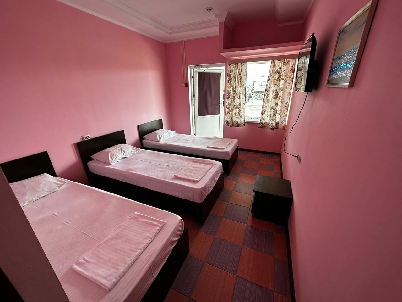 Ужас. Пришлось остановиться на ночь в этой гостинице. Номер простой, три односпальные кровати, постельное бельё чистое, есть полотенца. Санузел с душем в номере. На этом все плюсы. Номер полный мух, которые не давали спать всю ночь. Одно окно и то не открывается, проветрить помещение не возможно, нужно открыть дверь, отсюда видимо и мухи в номере. Включили кондиционер и просто задохнулись, его видимо вообще ни разу не чистили. И за такую ночь ужаса мы отдали 4500 рублей.