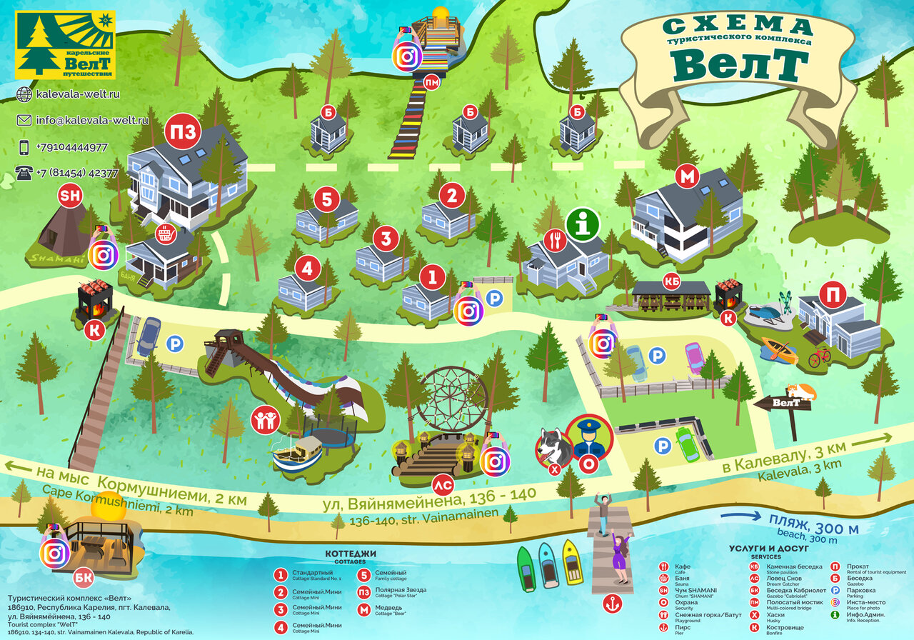 Заезд — с 14:00, выезд — до 12:00. Телефон: +7 (910) 444-49-77. Сайт: kalevala-welt.ru.