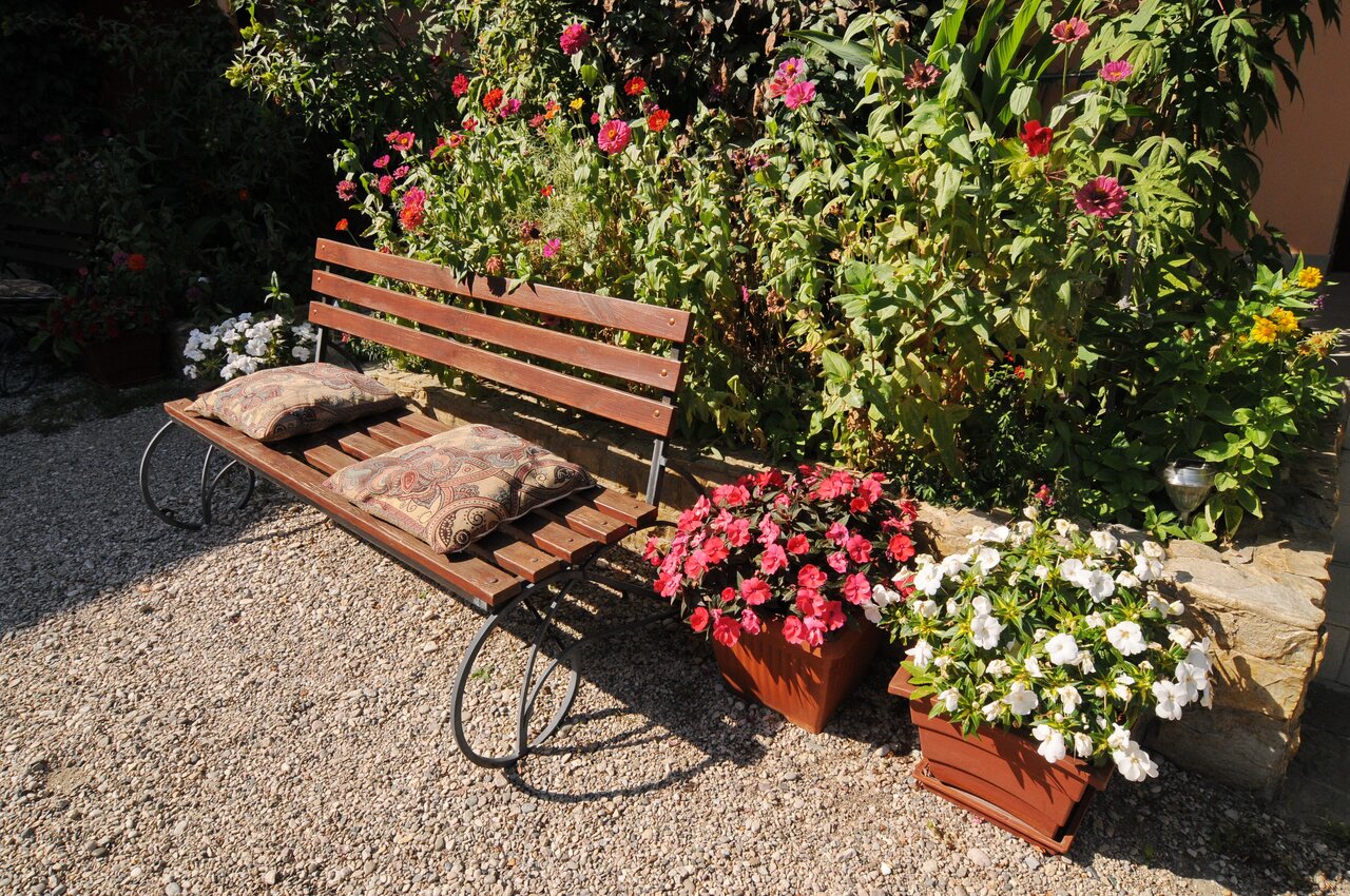 - Красивая зелёная территория с цветами и деревьями.