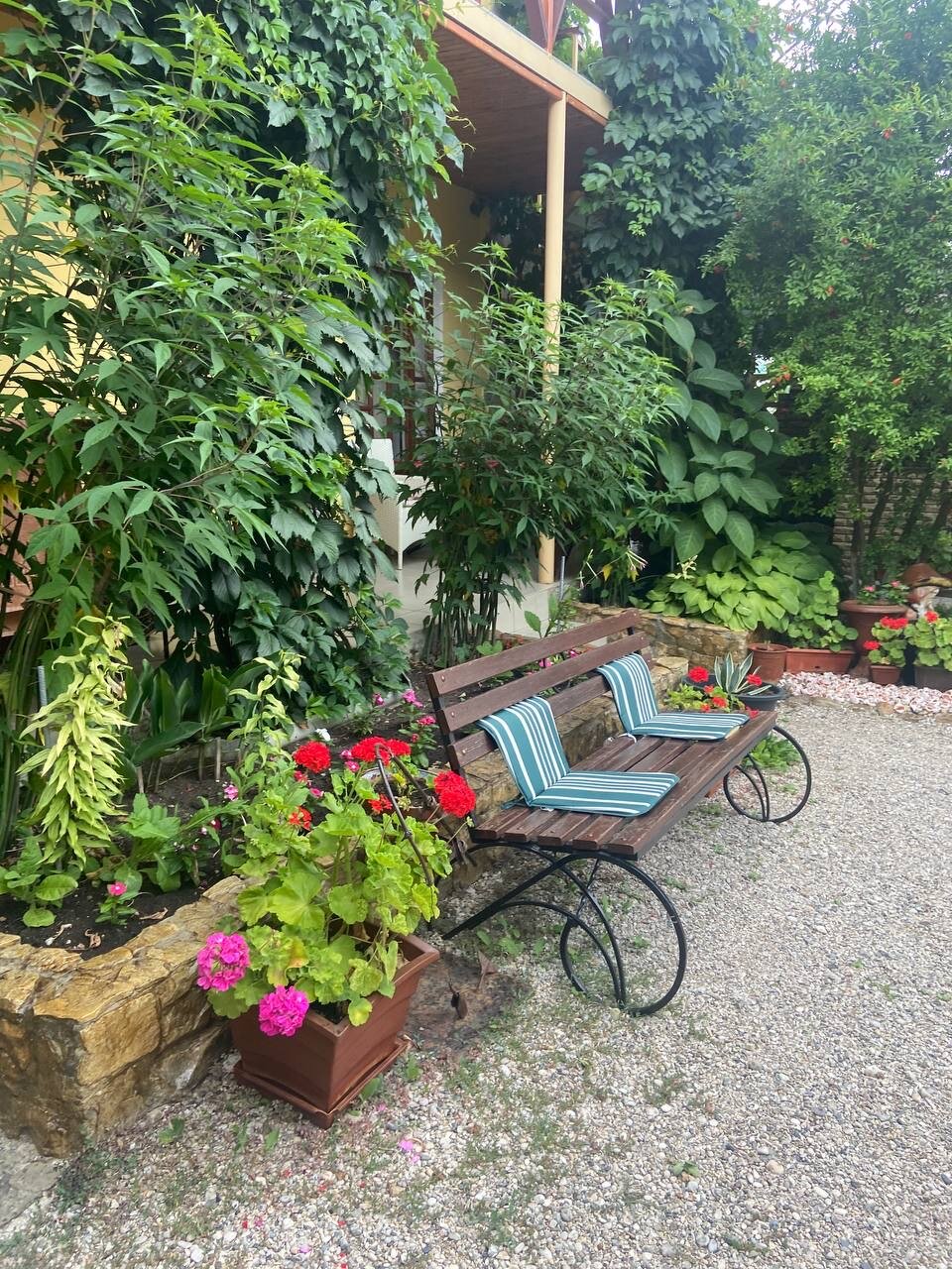 Отличное место, отзывчивые хозяева. Очень красивая территория, все вокруг зеленое, много цветов, деревьев. Есть разнообразные зоны отдыха, где вечерами можно посидеть с бокалом вина, любуясь звездами. Номера уютные, с холодильником и микроволновкой. Постель и полотенца отличного качества. Отдыхали с детьми, им больше всего понравился батут и черепахи Очень рекомендую это уютное и душевное место. Мне кажется, здесь приятно отдыхать даже в не сезон, наслаждаясь тишиной и видами