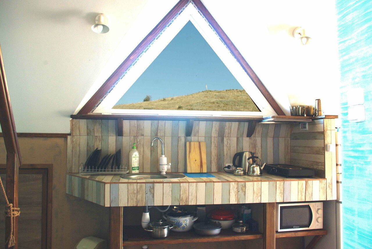 Кубрик: двухуровневый номер с кухней-гостиной и балконом. Вид на Карадаг.В номере: отдельная спальня, санузел c душем, кухня-гостиная с диваном, вся необходимая утварь.