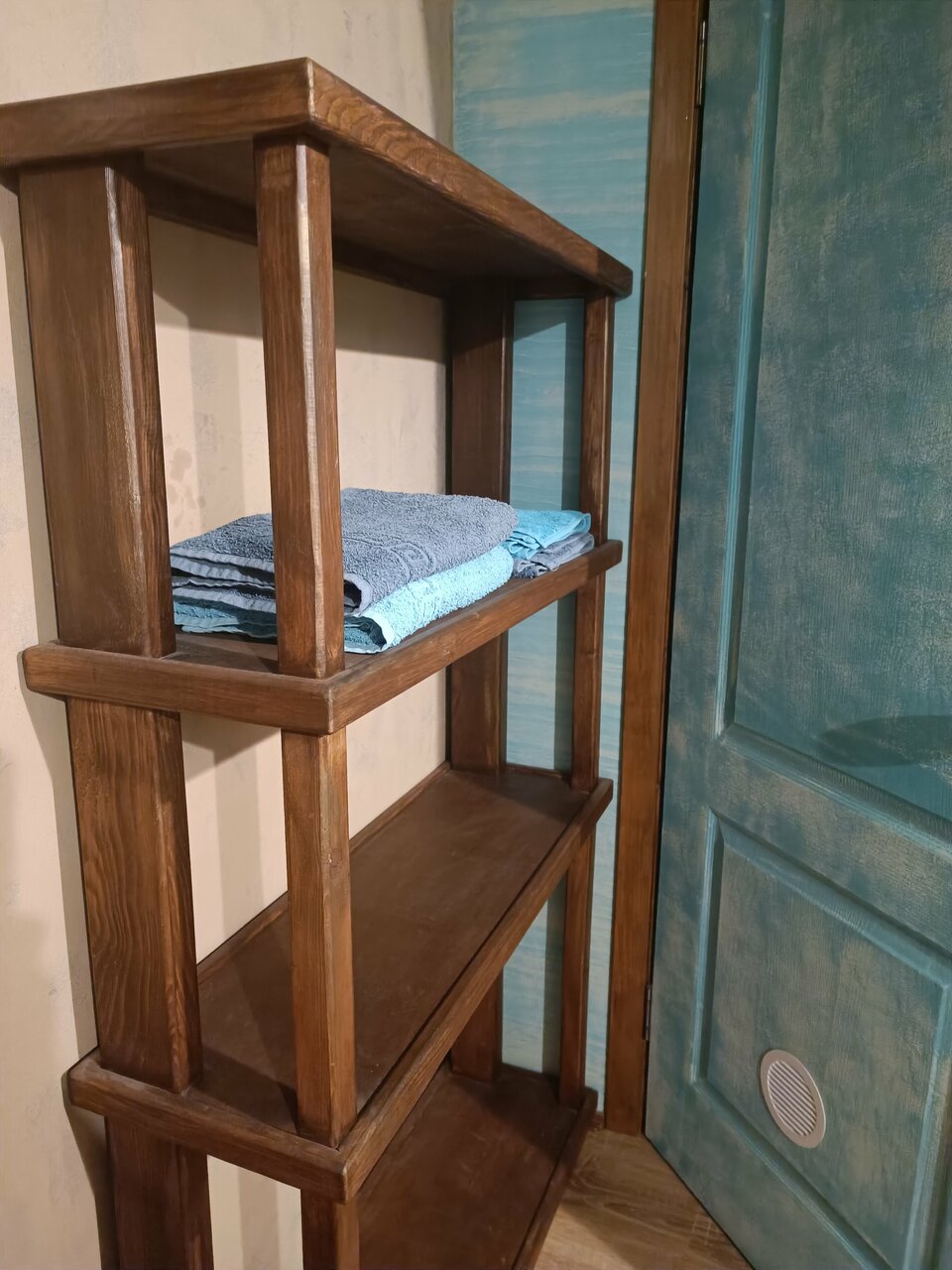 Санузел c душем, мини-кухня, вся необходимая утварь и посуда, чайники электрический и заварочный, гейзерная кофеварка, холодильник, :двуспальная кровать , ортопедический матрас, льняное постельное бельё.
