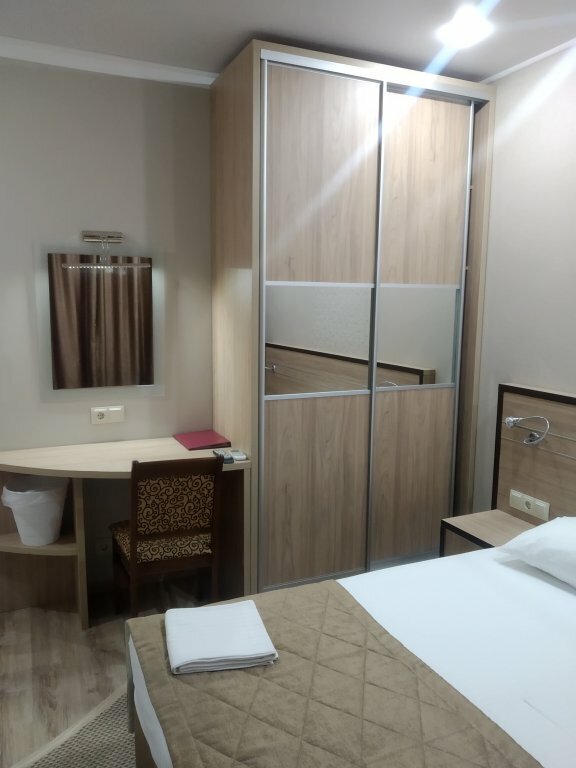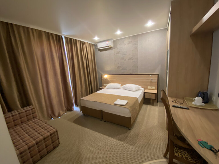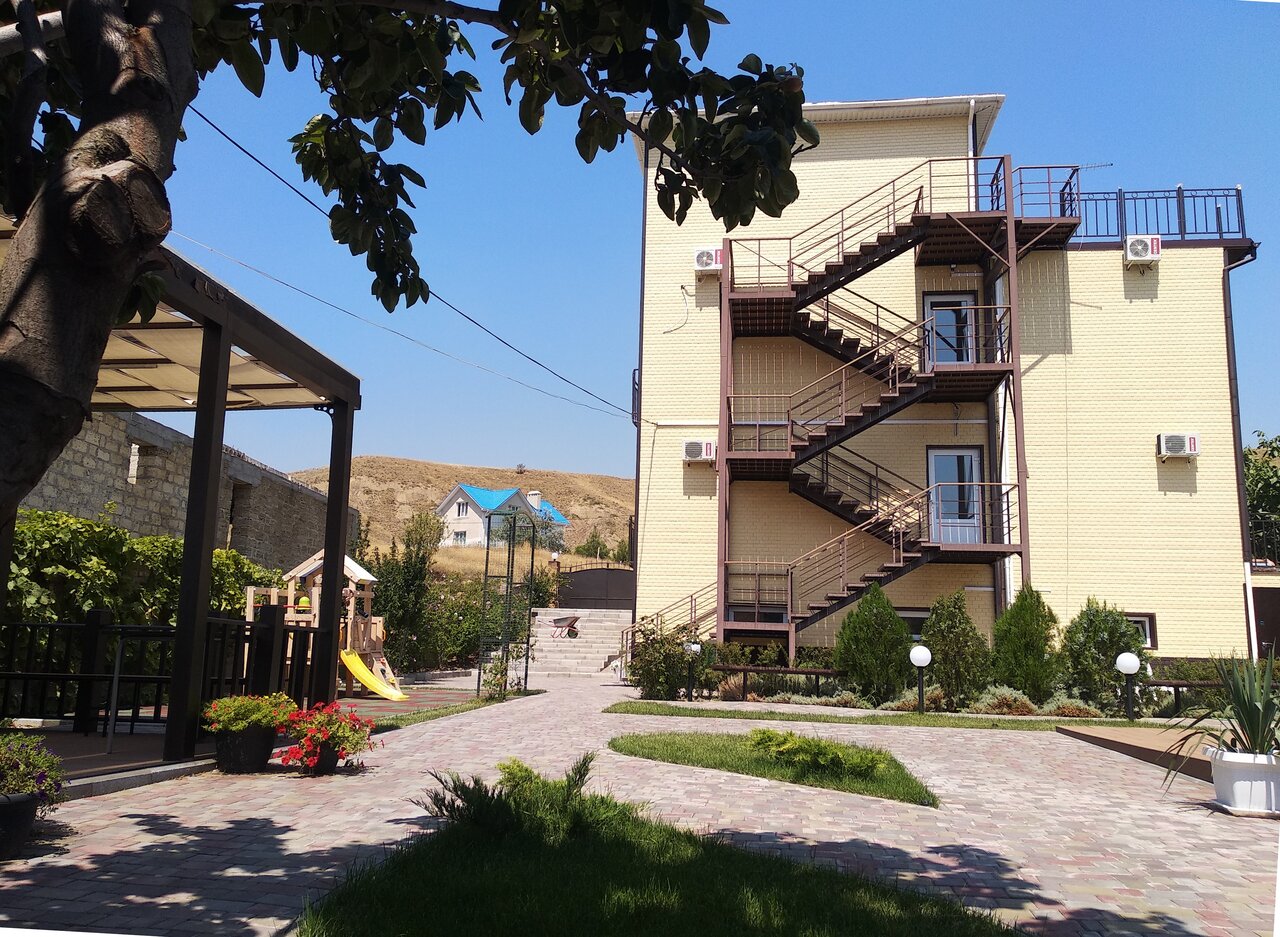 Время посещения: июль 2021 года. Отель отличный, новый. В номерах есть все необходимое: мебель, телевизор, кондиционер, чайник, посуда, полотенца и т.д. Ванная комната просторная, вся сантехника работает исправно, горячая вода есть постоянно. Территория отеля небольшая, но ухоженная: есть зона барбекю, бассейн неглубокий, зона отдыха. На первом этаже располагается небольшая столовая, где нас кормили завтраками (блины, сырники, тосты, чай/кофе/соки, йогурты, яблоки). Голодным не останешься. Wi-Fi на территории отличный. До моря далековато, но мы это знали. Отель расположен у подножия гор Кара-Дага, виды просто сказка До аэропорта хозяин Игорь нас отвёз в 6 утра (цена вопроса 2 тысячи рублей). Утром Елена накормила нас перед отъездом. Из минусов: хотелось бы уборку чаще, чем раз в 4 дня (хотя бы вынос мусора). Спасибо большое хозяевам за индивидуальный подход к каждому клиенту. Отелю процветания!