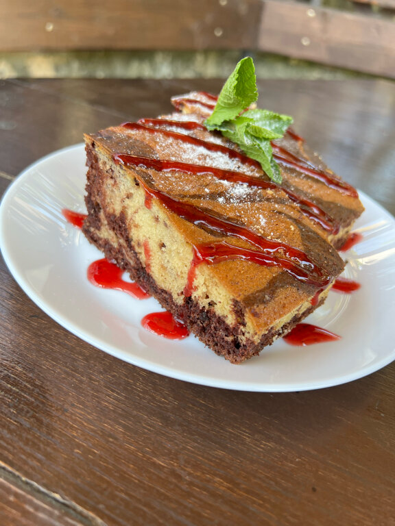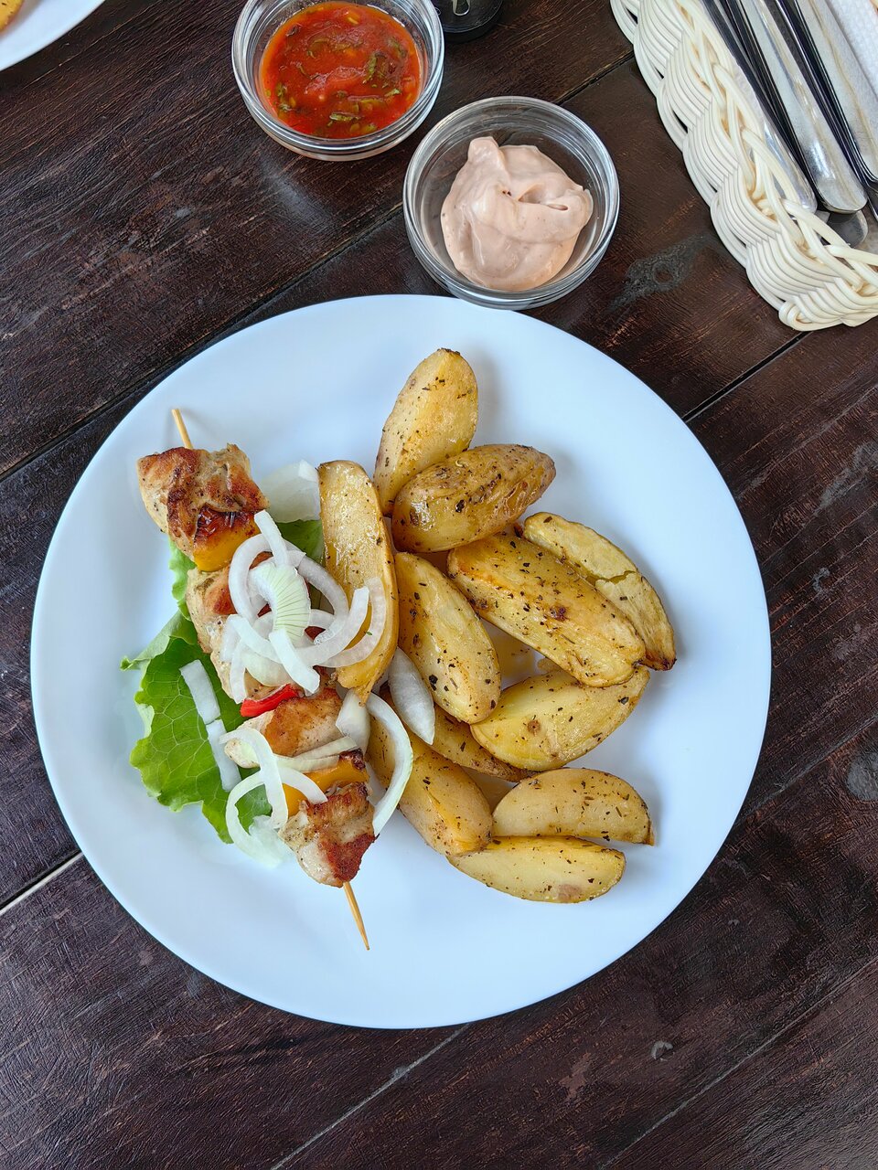 Расположен прямо перед морем. Хорошее питание, домашнее (дали бесплатный чизкейк в честь моего дня рождения:)). Не дорого