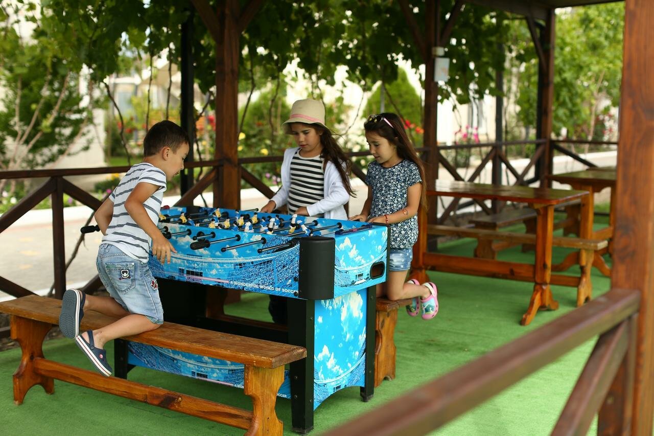 Отличное место для отдыха , есть бассейны(детский, взрослый) , с детьми занимаются аниматоры , завтрак включён ( шведский стол) , обед и ужин можно там же заказать =), детская площадка . Если хотите на море то пляж в 5-7 минутах ходьбы от отеля , персонал хороший, в номерах чисто. Очень приятно там находиться , реально расслабляешься в этом месте.