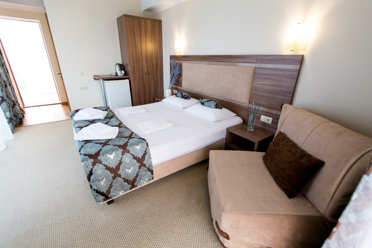 Удобства: — Собственный галечный пляж, аквапарк, сад и виноградник. — Услуги для активного отдыха: дайвинг, прокат велосипедов, водные виды спорта, йога, катание на лошадях. — Развлечения: дискотека, караоке, ночной клуб, дегустация вин. — Трансфер (платный/бесплатный), парковка, велопарковка. — Дополнительно: салон красоты, прачечная, общая кухня, детская площадка.