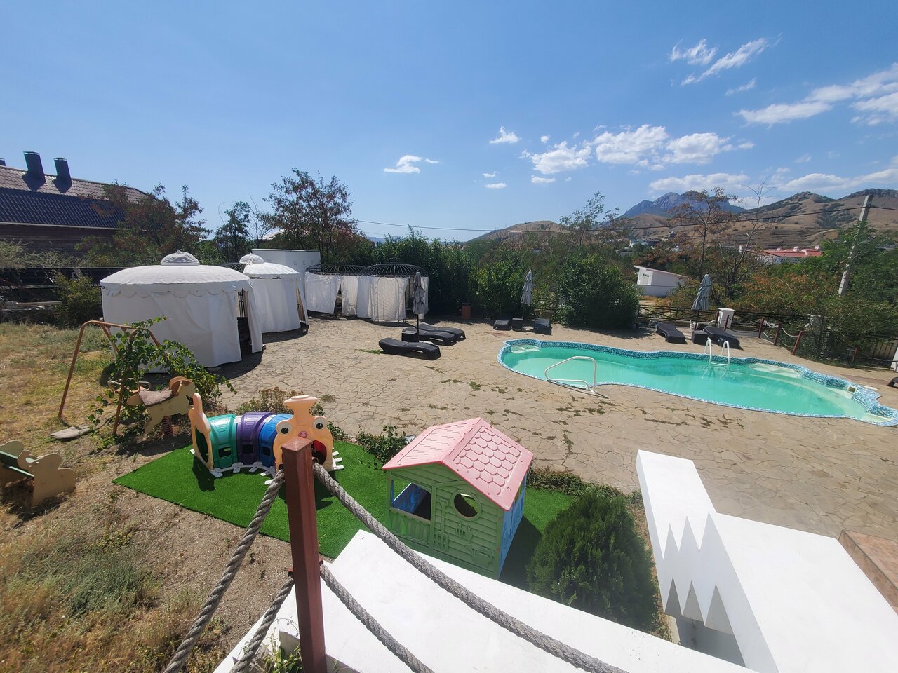 Были в июле, с детьми. Номер чистый, персонал доброжелательный. Обедать и ужинать можно в отеле, стоимость 500 р. со взрослого за приём пищи. Повар готовит вкусно по-домашнему. Хорошее расположение, от моря недалеко, прекрасно стрекочут цикады. В шаговой доступности Биостанция (дельфинарий, музей Кара-Дага, возможность сходить на пешую экскурсию).