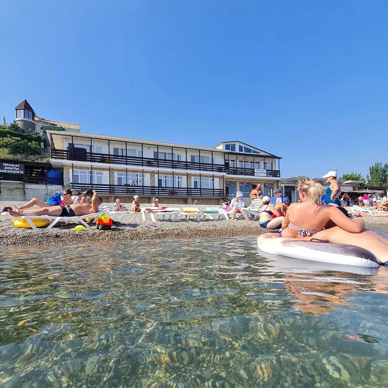- Хороший пляж (мелкая галька, чистое море, зонты).