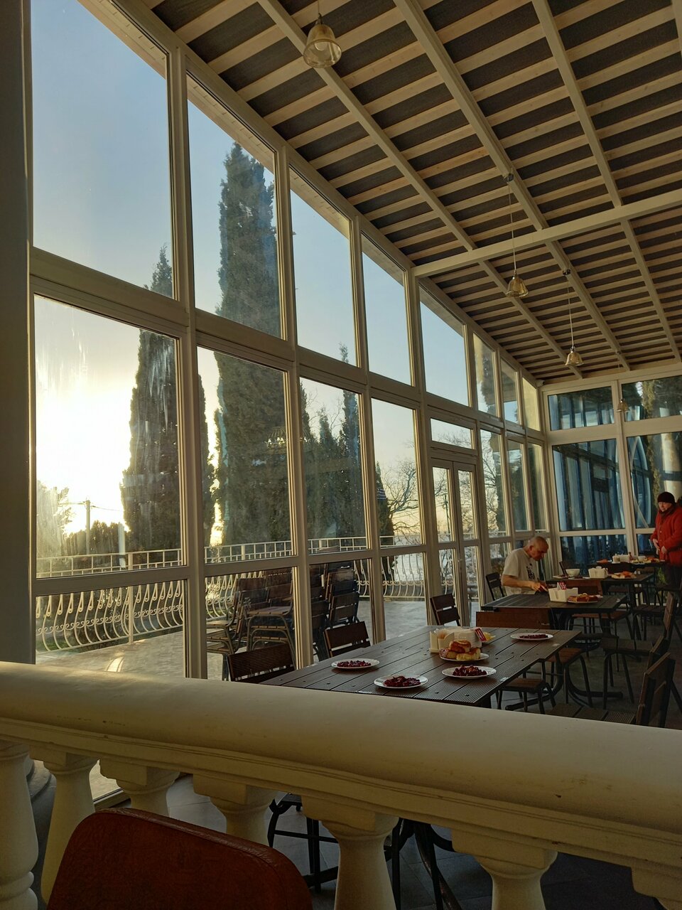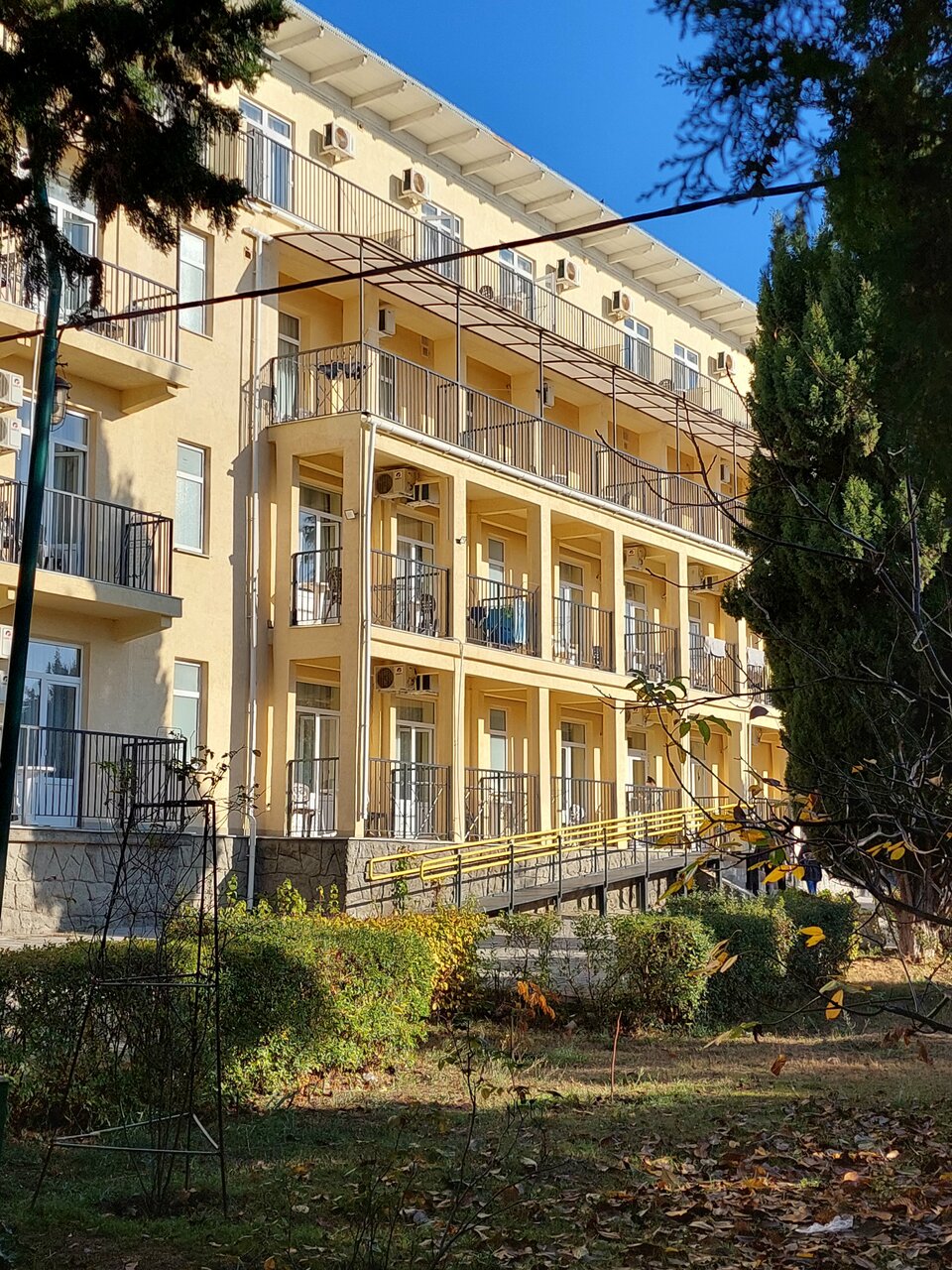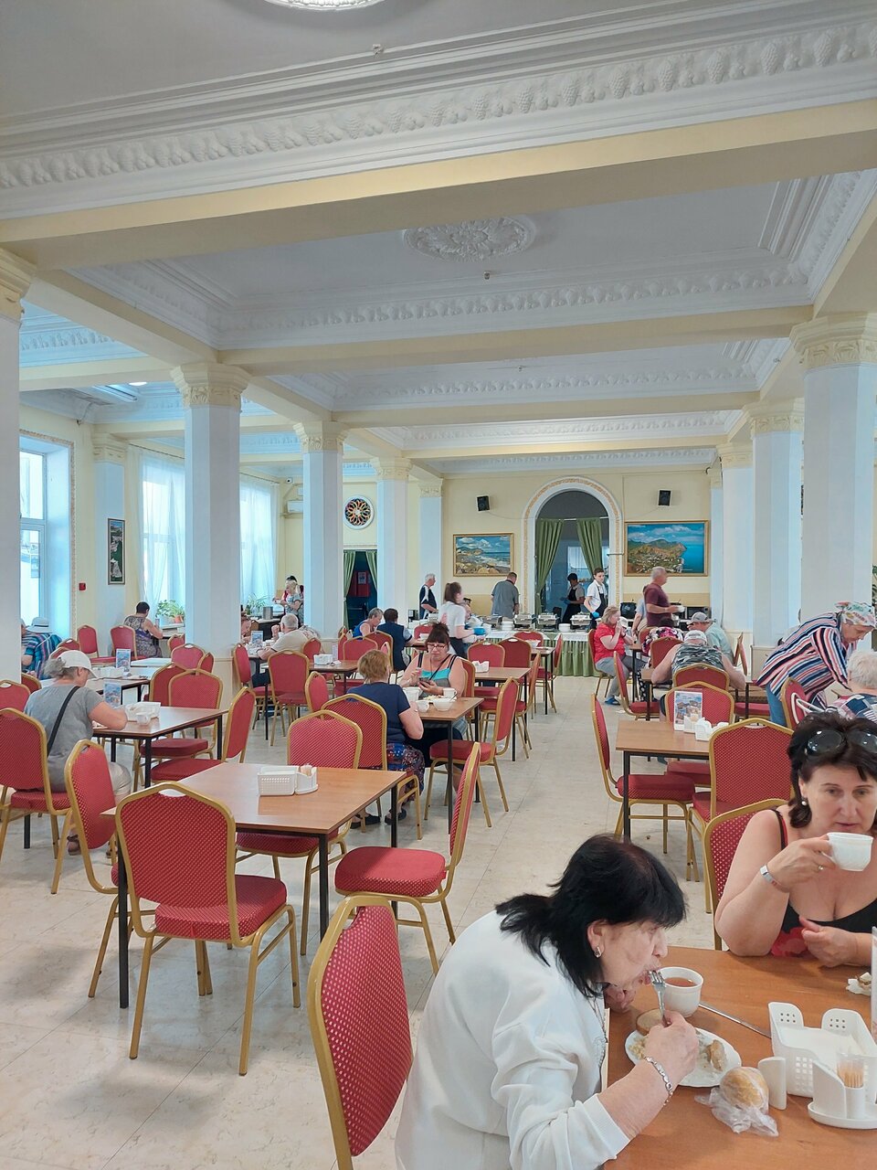 Отдыхаю сейчас. Ноябрь 2024 года. На первый взгляд санаторий мне очень понравился. Большая, красивая территория. Близость к морю. Удобные номера. Но. Нас разместили на 4 этаже без лифта. Лестница выполнена с грудейшими нарушениями нормативов. Ходить по ней очень сложно. Ступеньки разного размера и в разном количестве. Все время спотыкаешься. Но вот столовая — это постоянная борьба 3 раза в день. Нас определили во 2 смену питания. При входе в столовую двери постоянно закрывают, так как в зале очень много отдыхающих. Когда удаётся, наконец, добраться до стола, оказывается, что супов и каш уже нет. За столовыми приборами приходится побегать. Второе блюдо всегда холодное. Посуда часто одноразовая, пластиковая. Понятно, что накормить 700 человек трудно. Но зачем набирать 700 человек, если их невозможно накормить? Работники столовой работают старательно. Но столовой такое количество едоков просто не по силам. Надо с этим что-то делать!