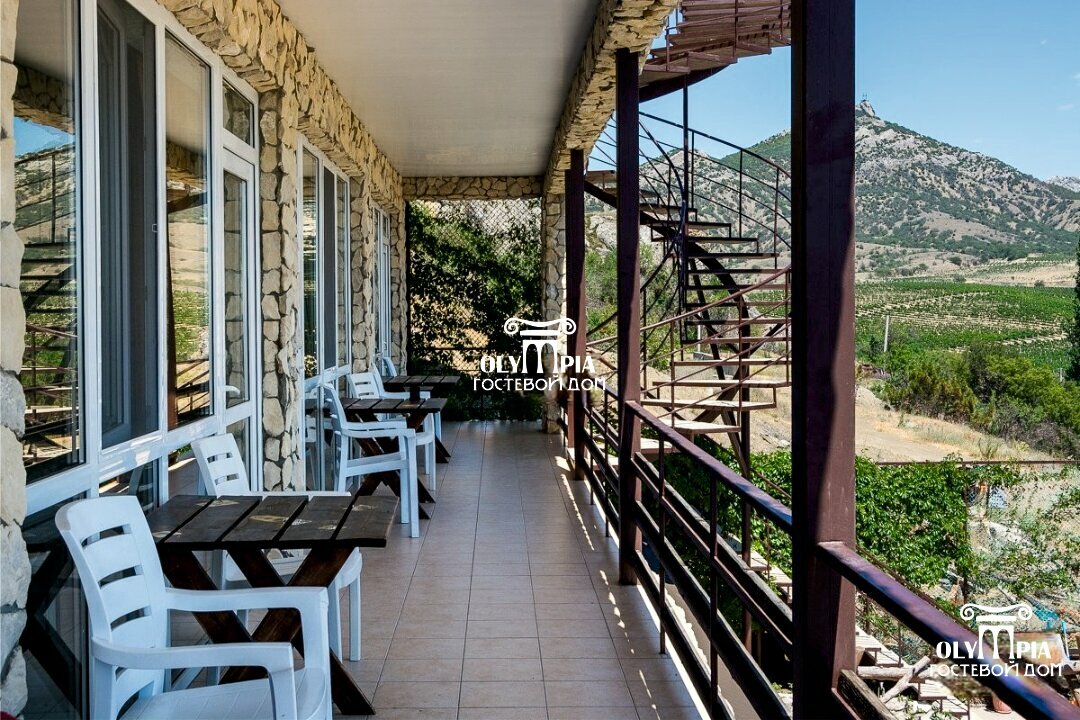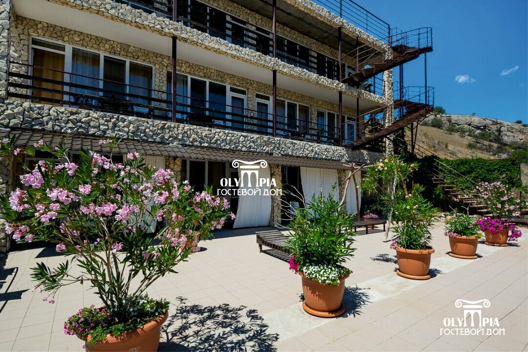 Отличное место для отдыха! В Курортное мы ездим уже 6 год, место полюбили за красоту гор, за спокойный семейный отдых. Олимпия — идеальное место для отдыха души и тела. Расположение в живописном месте, с видом на Кара-Даг, засыпаешь под пение птиц, а просыпаешься, глядя на всю эту красоту! Утренний кофе на природе , кто любит кофе, поймёт. В Олимпии — очень гостеприимный и дружелюбный хозяин, угощает вкусным вином и шашлыком. Много семей отдыхает с детками. Территория в цветах, есть все необходимое для проживания. То, что пишут, что добираться не удобно, не правда, мы приезжаем на машине, спокойно поднимаемся по дороге, оставляем машину на стоянке и гуляем пешком. До пляжа с детьми — 7 минут ходьбы. Еще один плюс — цена проживания приемлемая, нам есть с чем сравнить, и поэтому приезжаем в Олимпию каждый год. Желаем Олимпии так держать и только процветать !!!! Из минусов, для себя не нашла не один.
