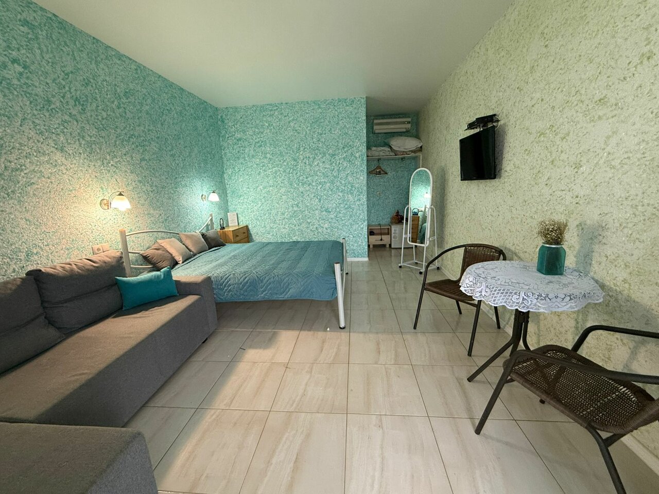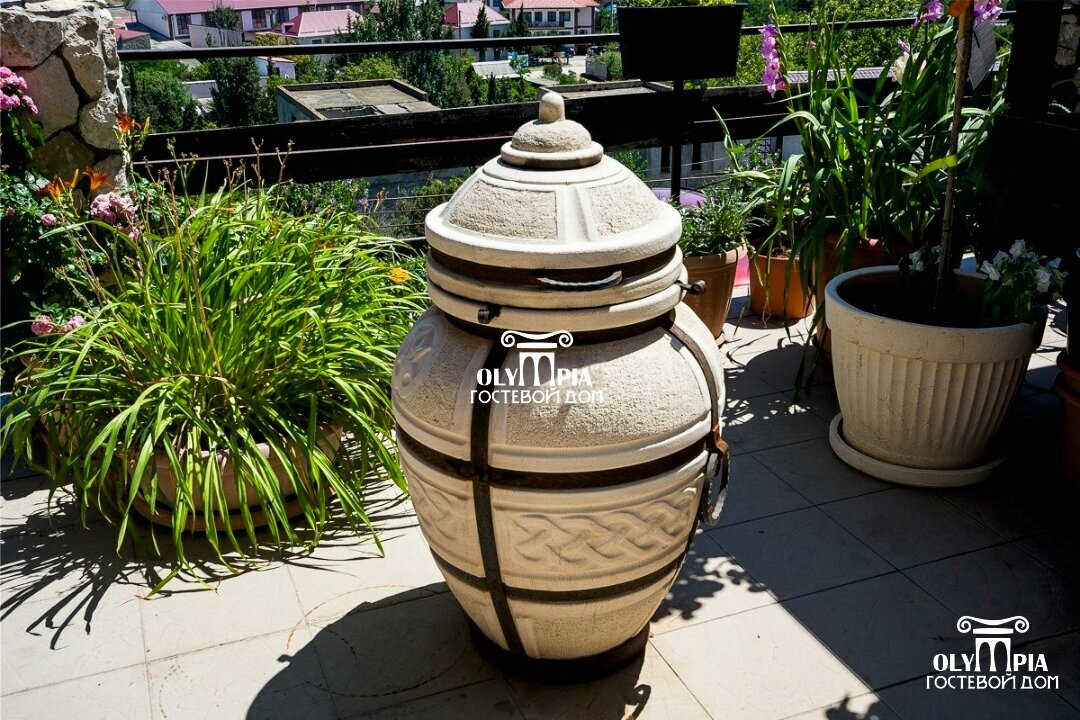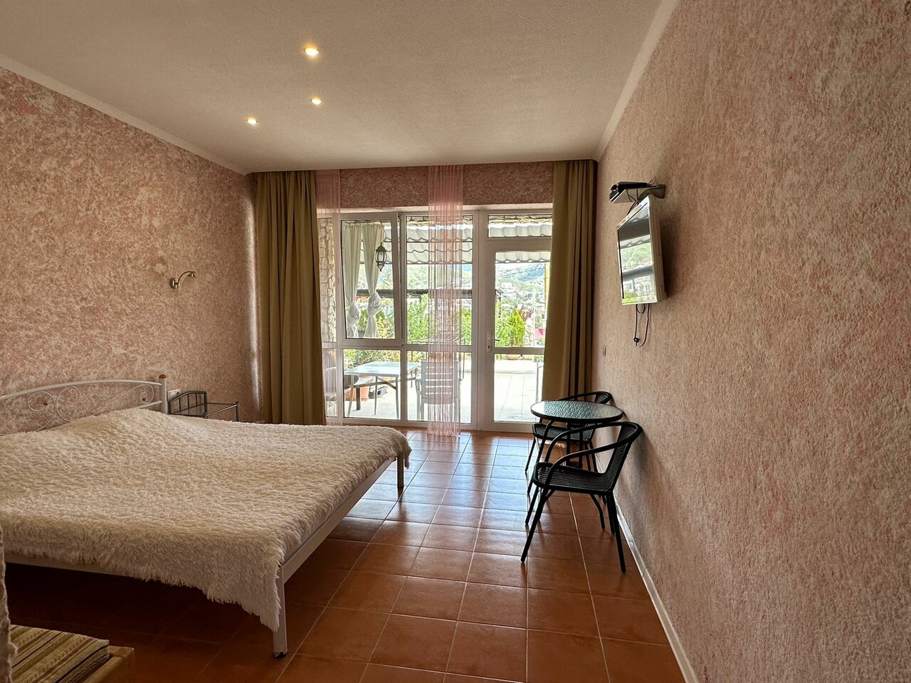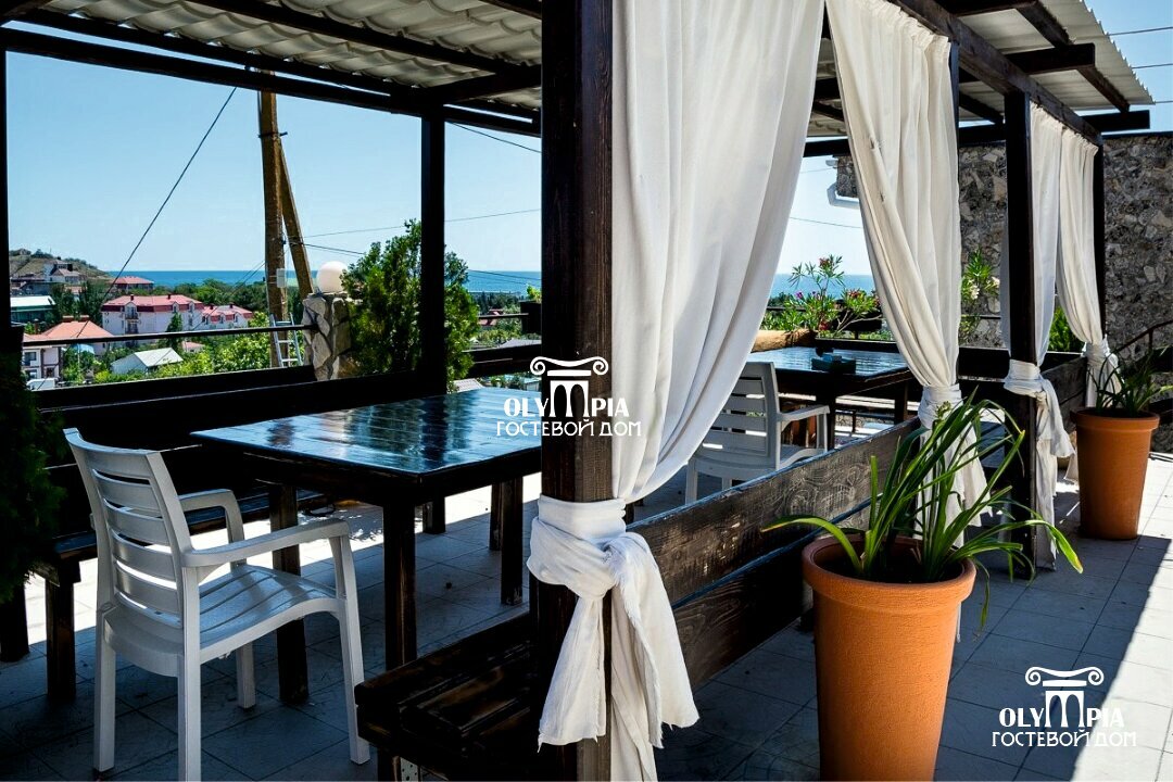 Вид захватывает настолько , что кажется сказочной.. Порадовала возможность принимать пищу в разных локациях — у номера уютный уголок , на террасе под навесом , на крыше ! И везде в поле зрения красота гор, цветов, виноградников. Пляж , кафе , магазинчики и рынок в 10 минутах ходьбы. Что радует . Номер уютный, кровать большая и спать на ней комфортно. Wi-Fi, кондиционер, TV , небольшой холодильник, шкаф, комод — всё необходимое есть. В общей зоне есть посуда для приготовления, стиральная машинка , сушилки для белья большие и маленькие индивидуально по номерам. Зарядки делала, танцевала , есть возможность и побыть наедине с собой , и пообщаться с гостями . Фото и видео контент из ‘Олимпии’ просто ! Все спрашивали , где это такая красота ? . Кайфанула в общем , РЕКОМЕНДУЮ этот гостевой дом от ДУШИ