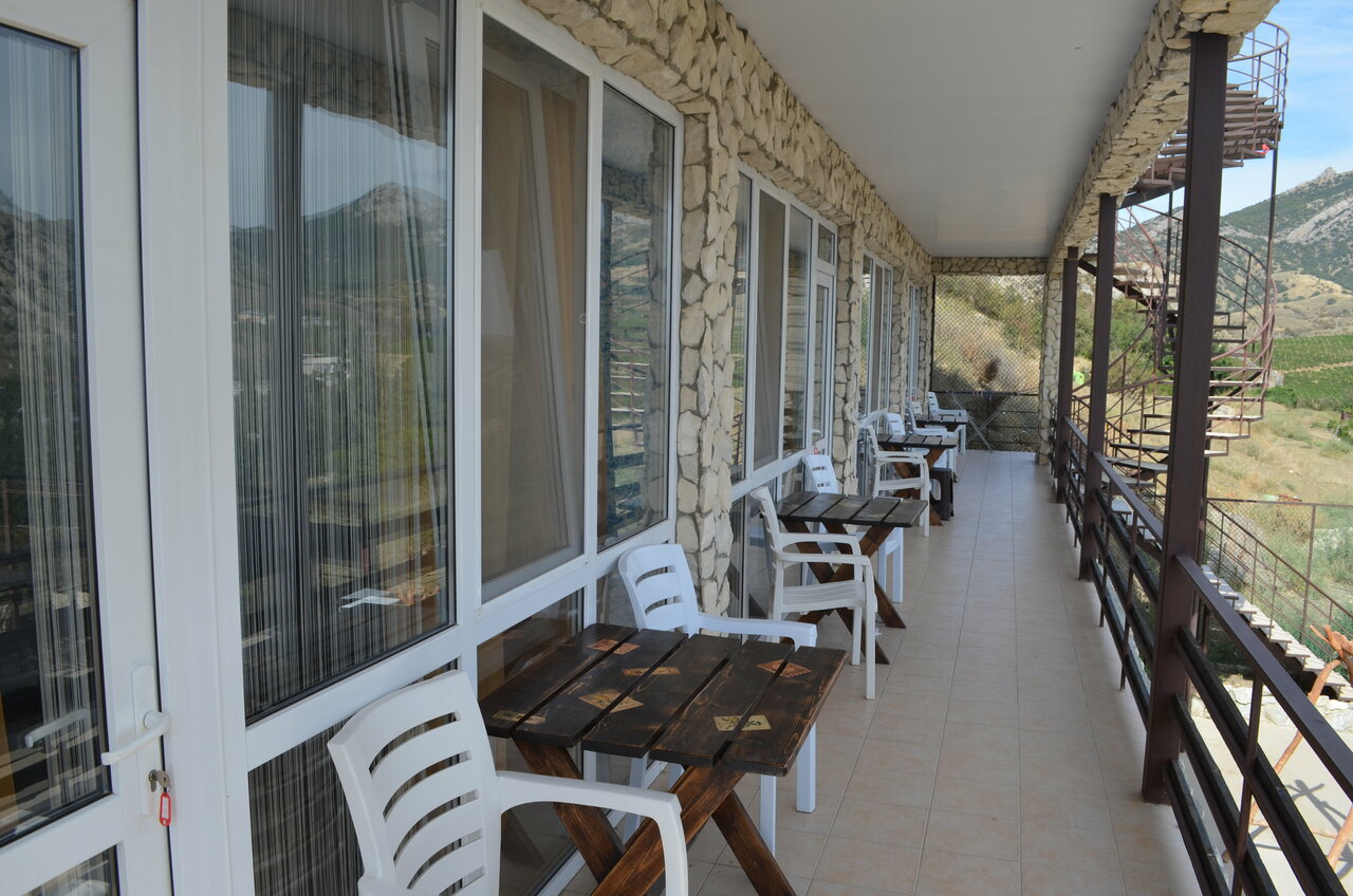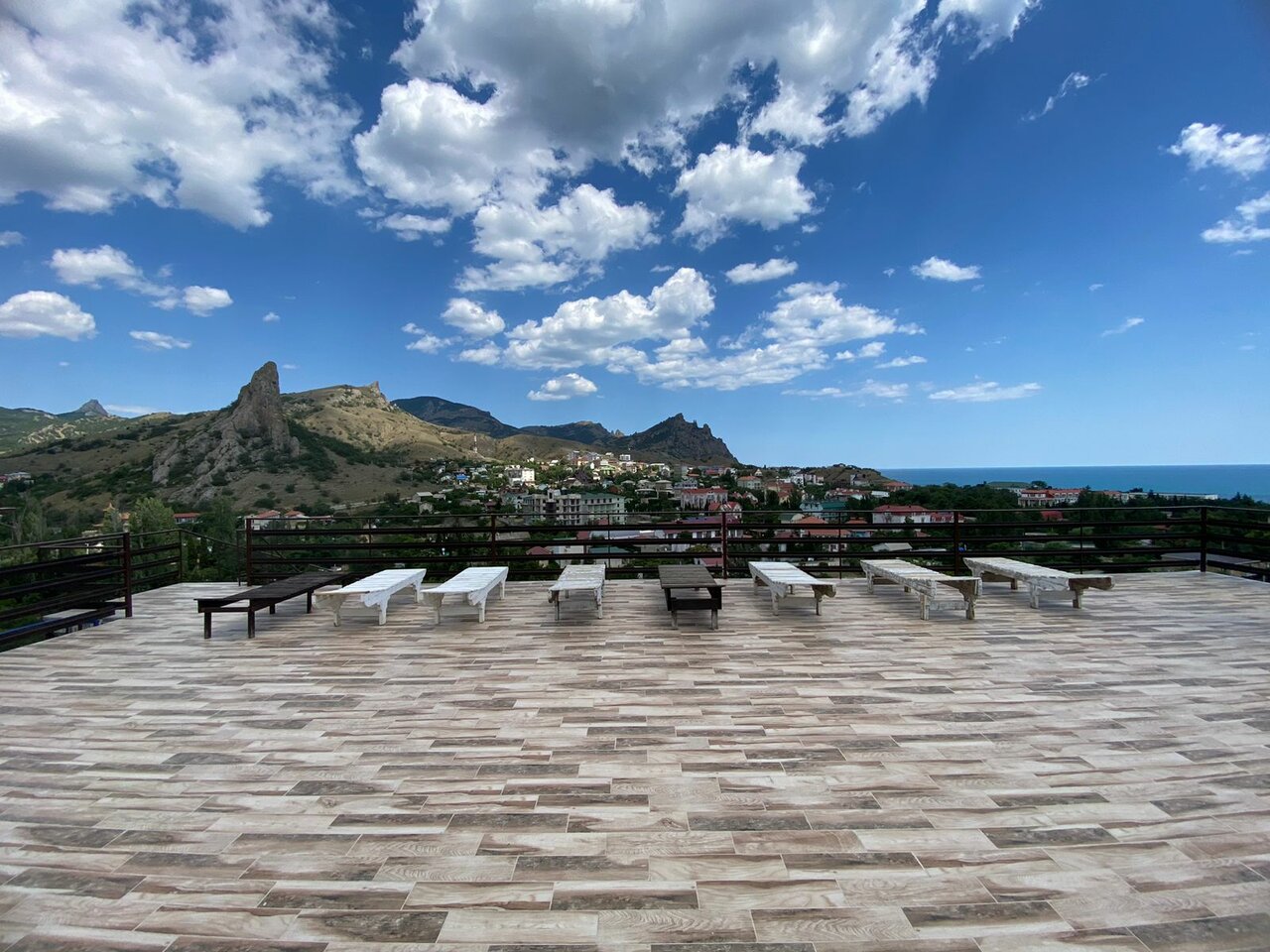 Останавливаемся 4 год в этом отеле. Красивейший вид на Кара-Даг, такого нет нигде в посёлке, прекрасная комфортная территория в цветах и со всеми удобствами, радушный хозяин, который угощает вкуснейшим домашним вином. До пляжа 10 минут пешком по гравийной дороге, в обратную сторону в небольшую горку, но это плата за чудесный вид на горы и посёлок. Перед отелем стоянка для машин — удобно.