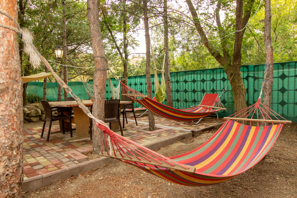 - Ухоженная и зелёная территория.; Приветливая и отзывчивая хозяйка.; Мангальная зона и зона отдыха с гамаками.; Есть парковка.; Доступные цены.