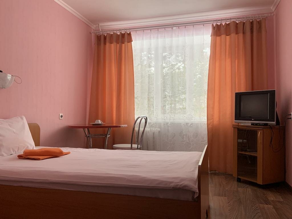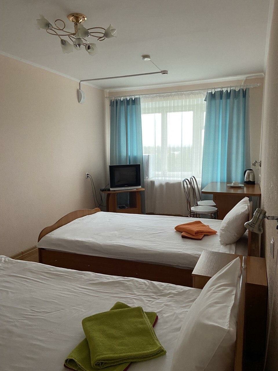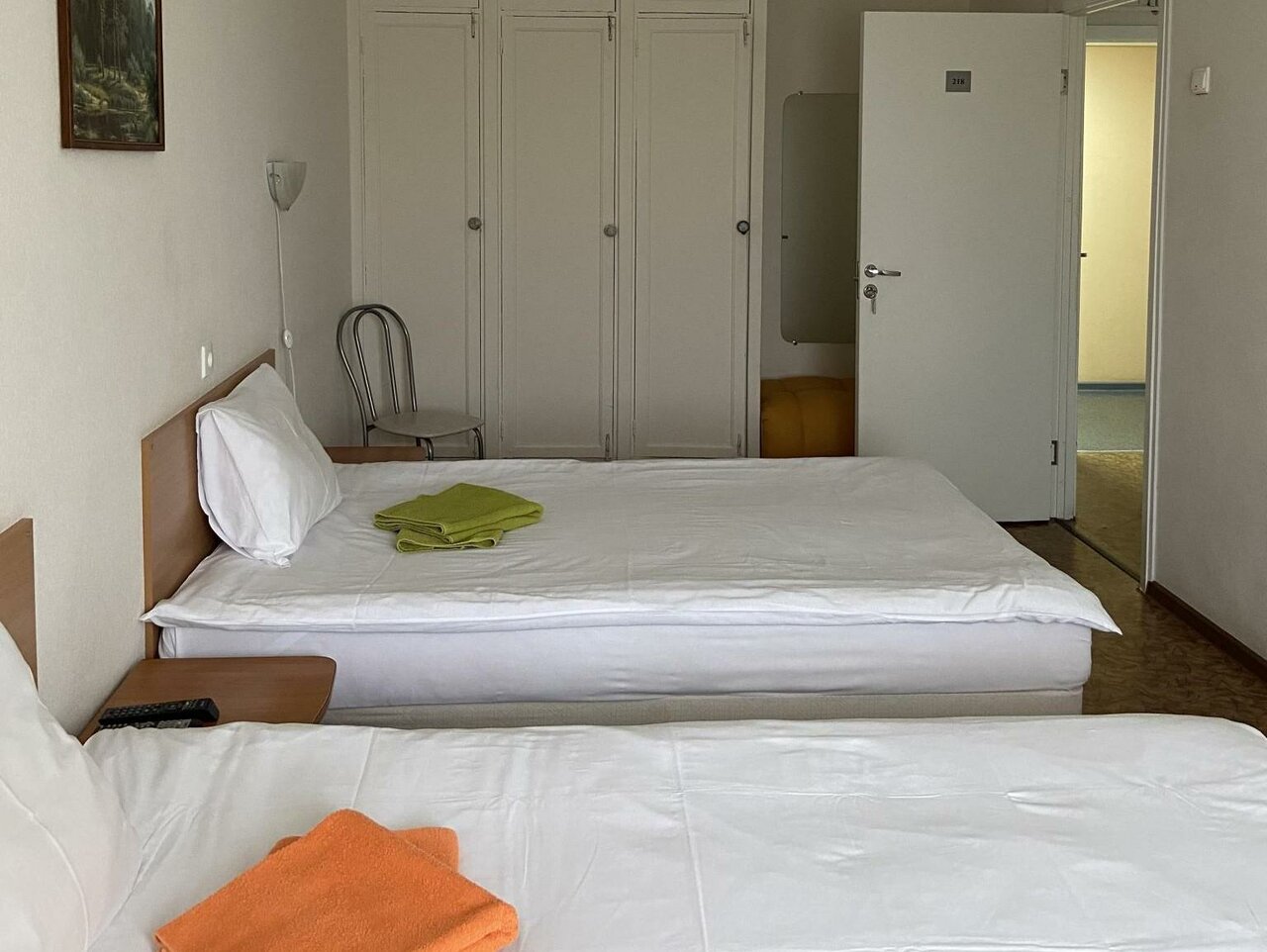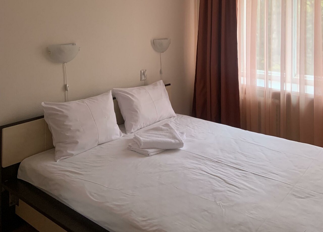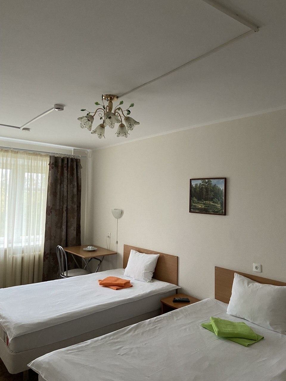 Гостиница без звезд. Если честно-такую нужно поискать. Гостиница из разряда назад в СССР -с 2019 года ровным счетом ничего не изменилось. С питанием беда, его просто нет, НИКАКОГО. Селитесь надолго — запасайтесь продуктами . Парковка за деньги, 300 в сутки. Лифта, пандуса нет. Номера в блоках: в предбанникехолодильник и чайник, душ и туалет , далее две двери: одноместный(2500) и двухместный(3500).В номере: старый тв(ЭЛТ), кровать, тумба, стул, креслице, стол, мелкая тарелка,кофейная кружка.Отопление работает (конец мая).