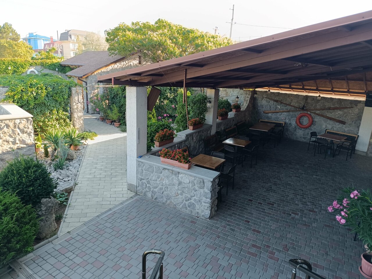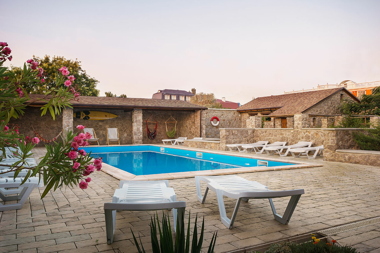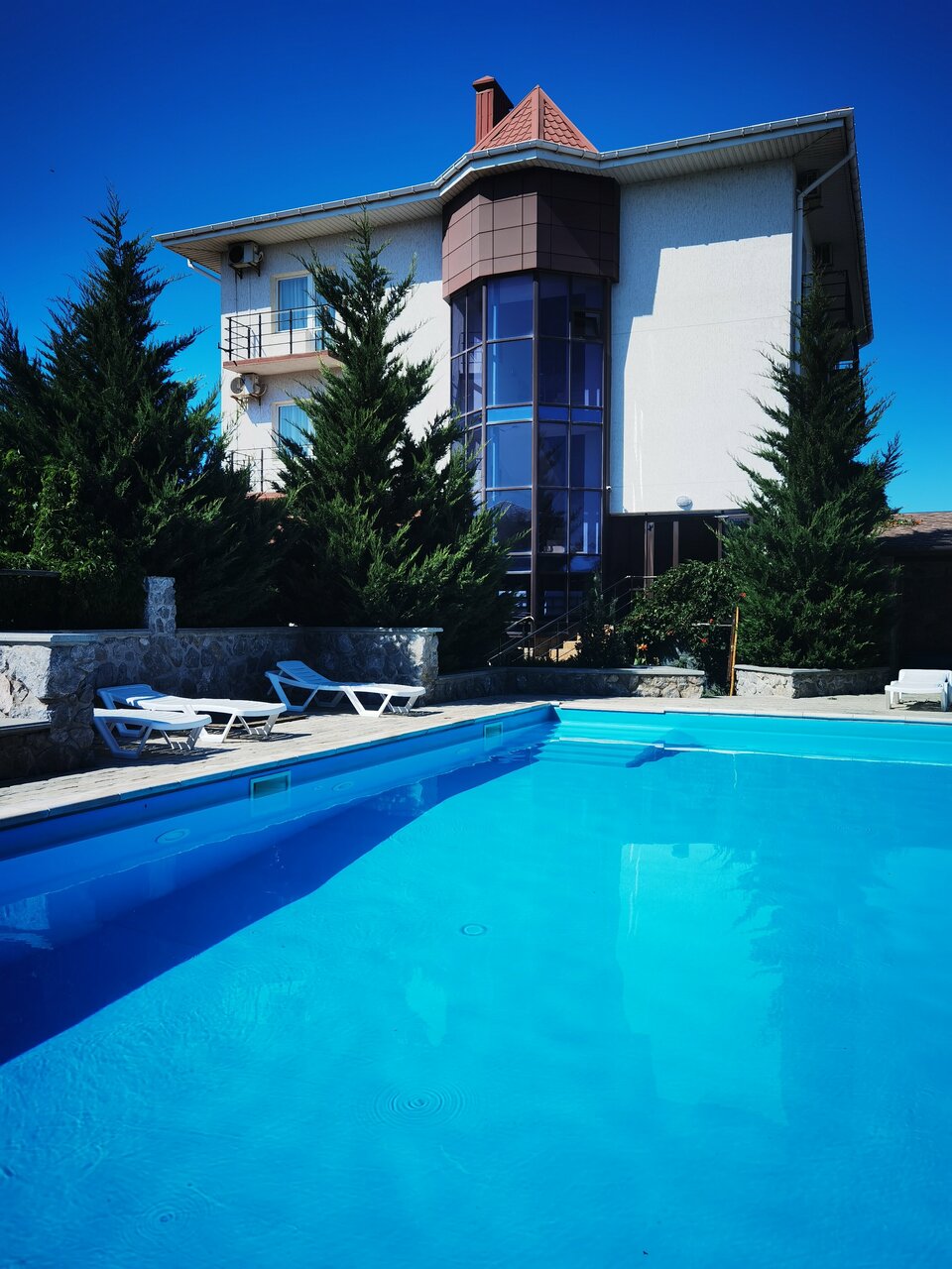 Чистые просторные номера. Уборка ежедневно. Бассейн на территории. Удобная мангальная зона. Ечть детская площадка. До моря 10мин неспешным шагом.