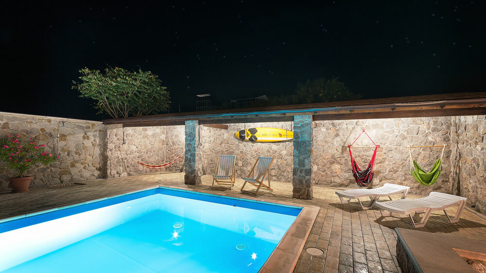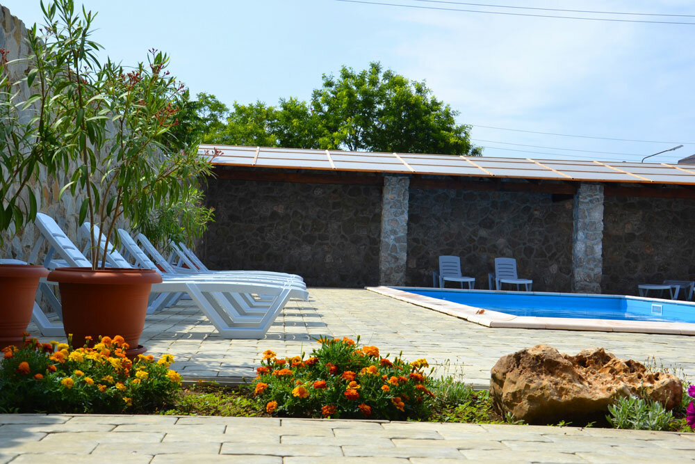 - Большой и чистый бассейн (подходит для детей и взрослых).; Радушные и гостеприимные хозяева.; Мангальная зона и шезлонги.; Вкусное питание (шведский стол).; Близость к морю (5–10 минут пешком).